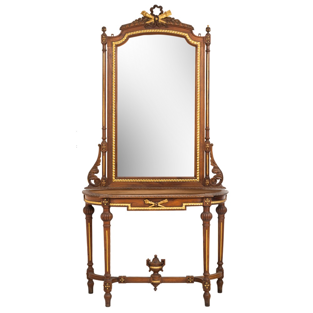 Consolle con specchiera stile Luigi XVI in legno di noce con fregi dorati.