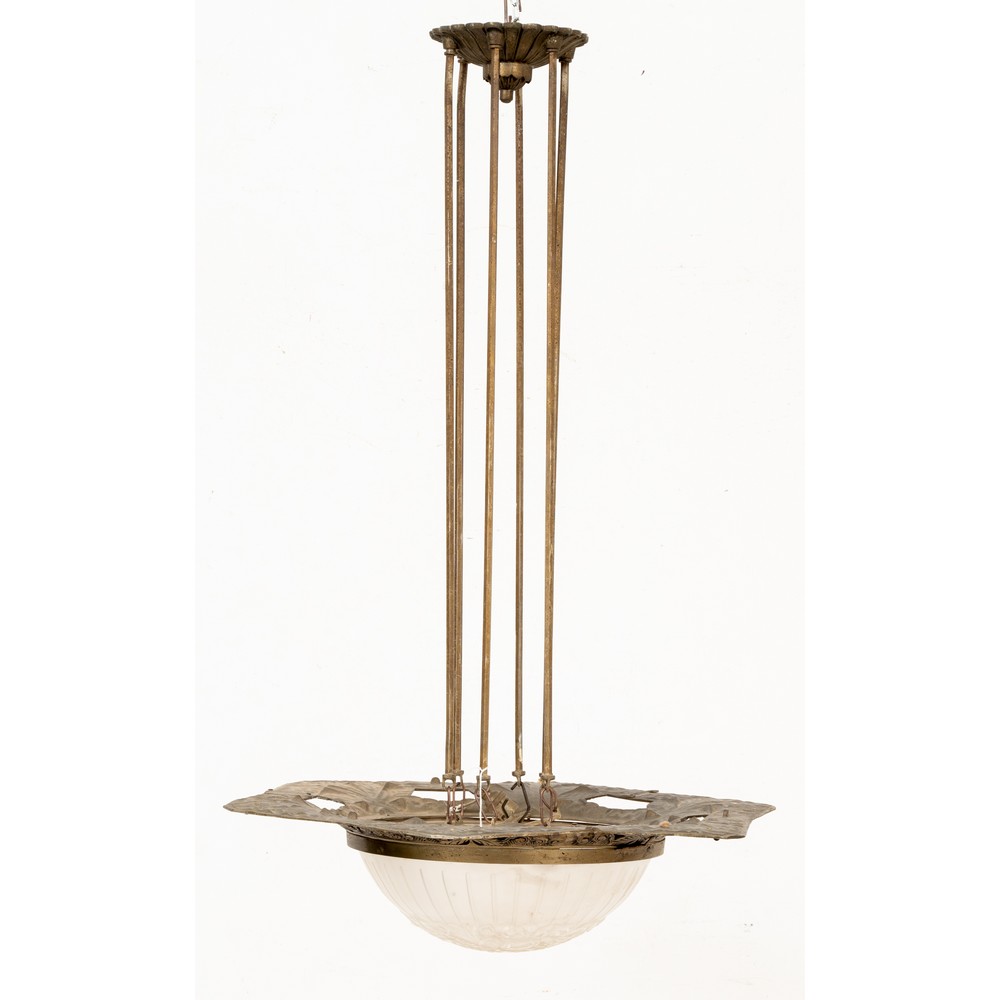 Lampadario a due luci in ottone con coppa in vetro lavorato.