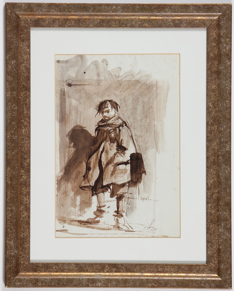 ANNIGONI PIETRO (1910 - 1988) Giovane mendicante. 1932. China e acquarello su carta. Cm 23,50 x 34,00. Firmato e data in numeri romani XXXV in basso a destra.