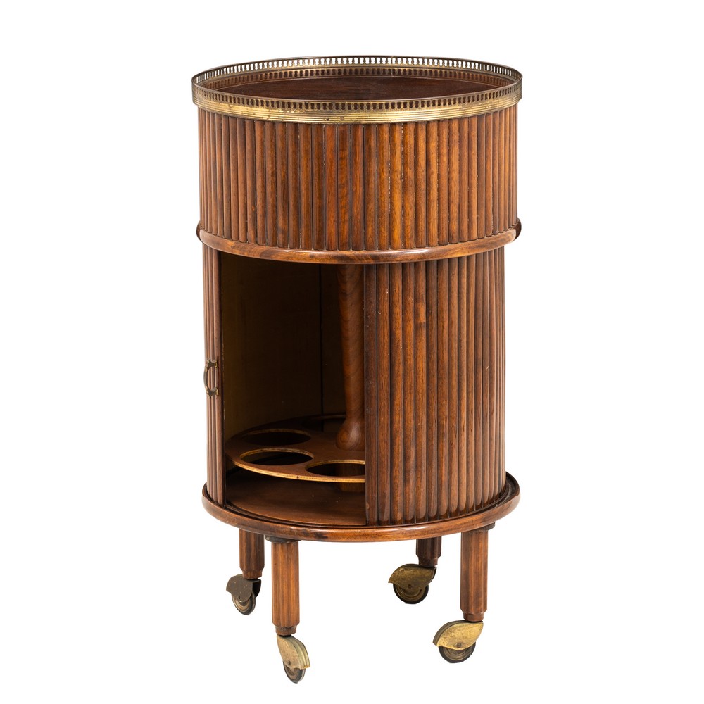 Porta bottiglie a tamburo in legno di mogano con apertura a serranda, ringhiera in ottone, piano apribile.