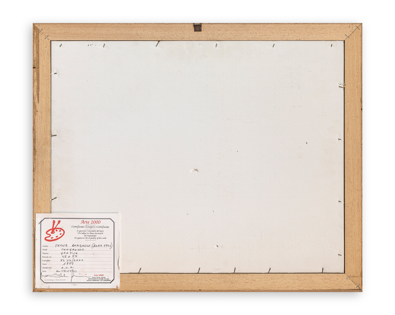 Certificato di autenticità a cura della Galleria d'Arte 2000 (PD) al retro del cartone protettivo