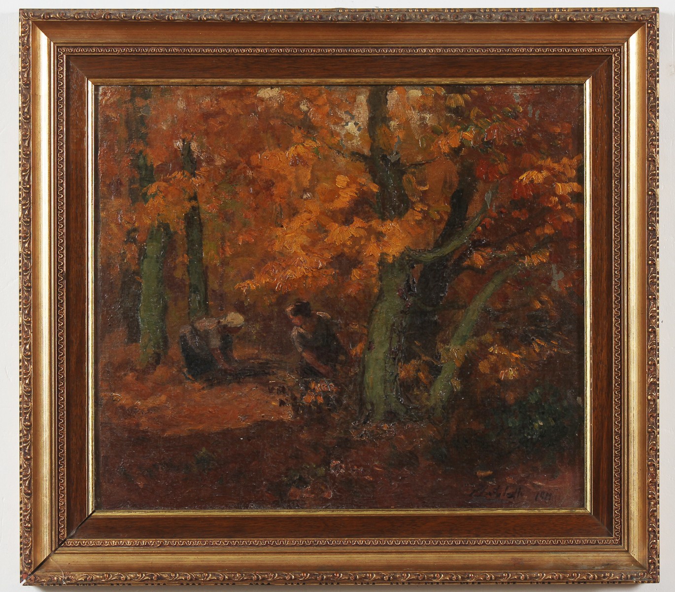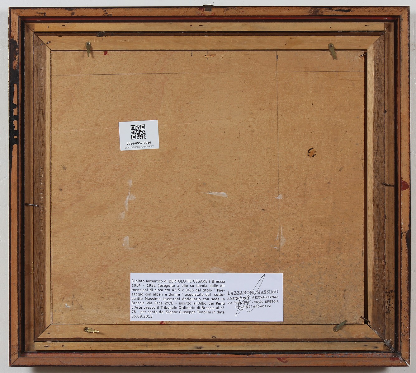 BERTOLOTTI CESARE (1854 - 1932) Paesaggio con alberi e donne. 1911. Olio su tavola. Cm 36,50 x 42,50. Firma e data in basso a destra. Autentica su fotografia a cura di Massimo Lazzaroni. Cornice presente