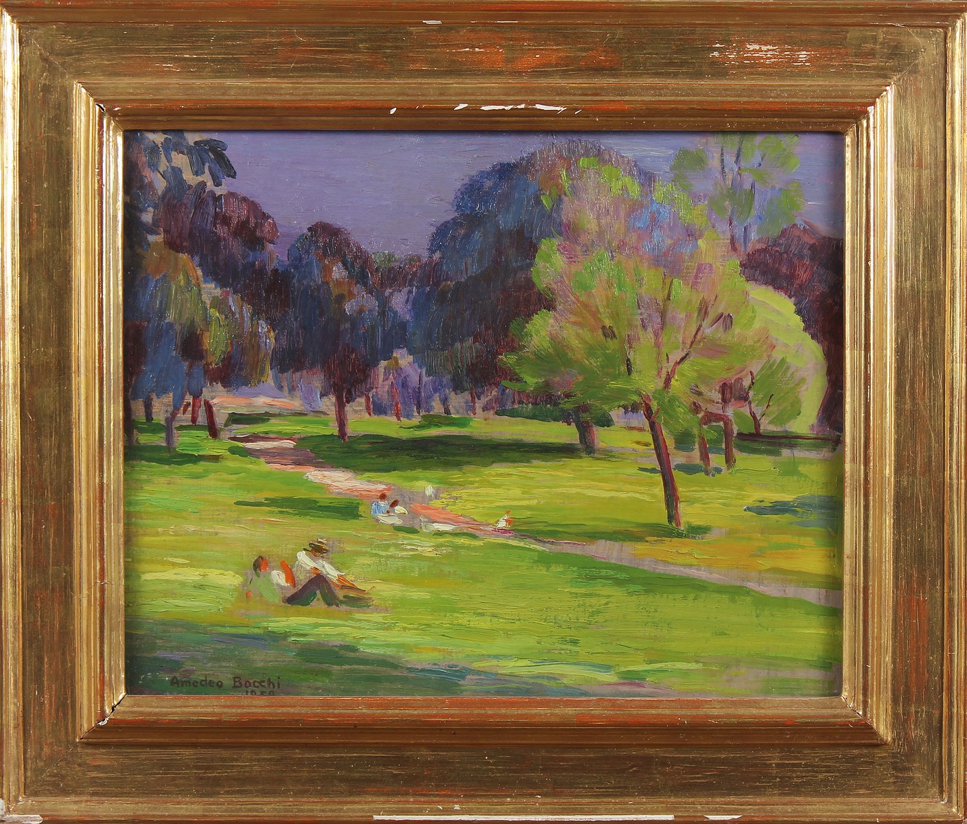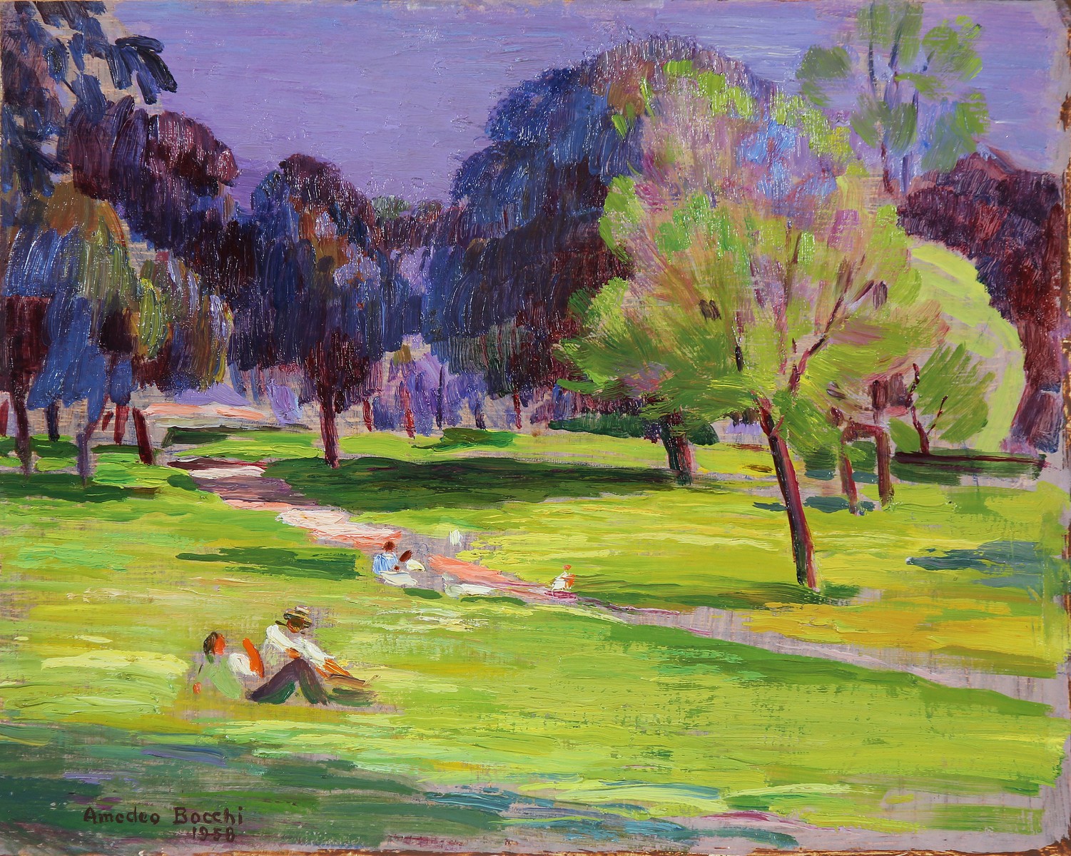 BOCCHI AMEDEO (1883 - 1976) Pomeriggio nel parco. 1958. Olio su tavola. Cm 50,00 x 40,00. Firma e anno in basso a sinistra. Opera archiviata presso gli archivi del Museo Amedeo Bocchi, Parma, come da documentazione fotografica allegata all'opera riportante il relativo numero d'inventario. . Cornice presente