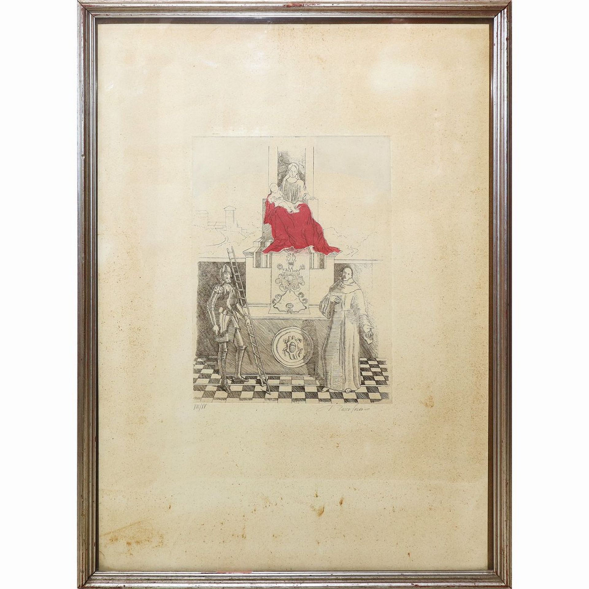 Salvo Russo (Aci Castello 1954) - Incisione Madonna con bambino e santi dimensione battuta mm.336x248, in cornice 74x54 acquaforte colorata esemplare 13 su 15
