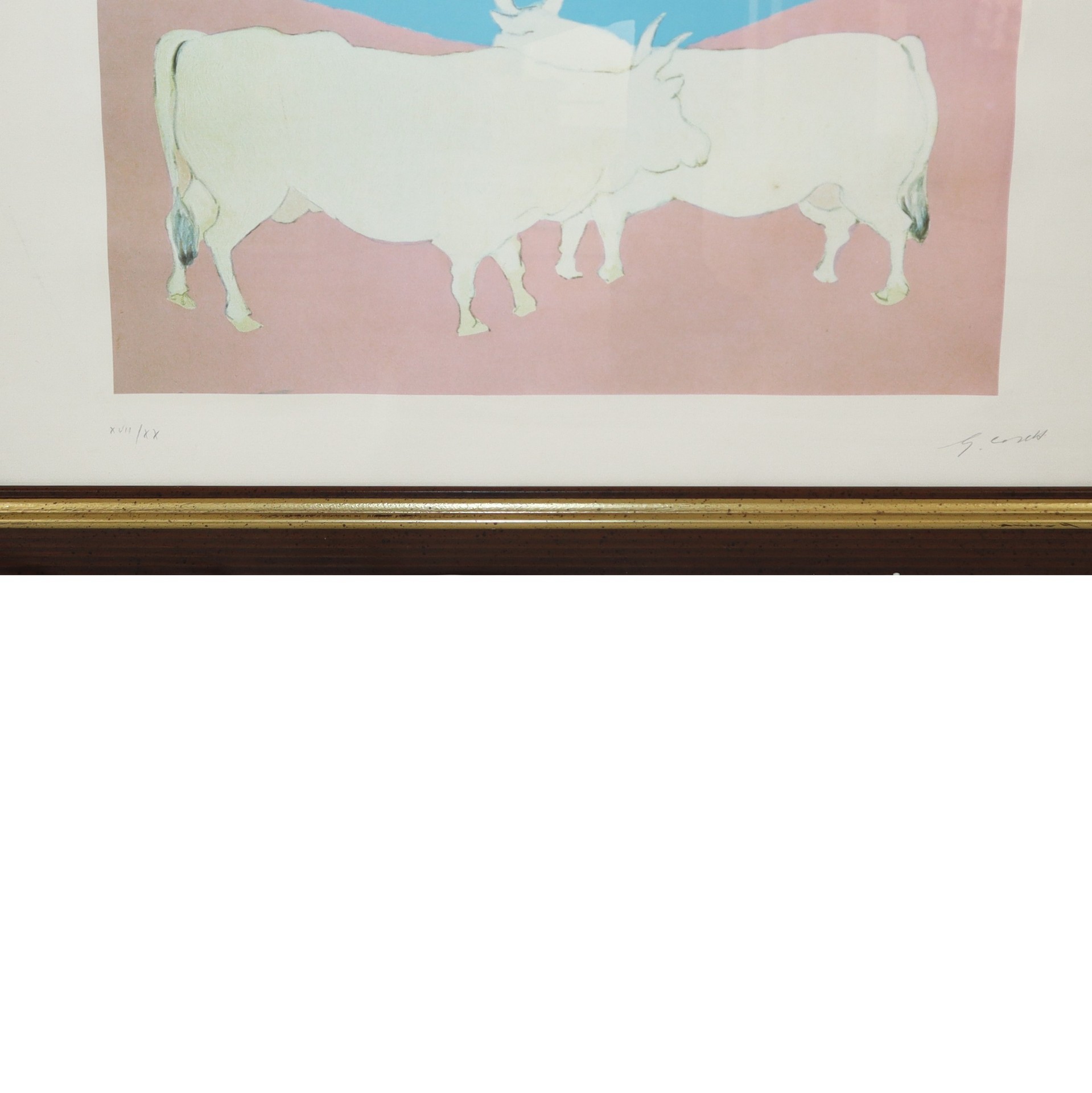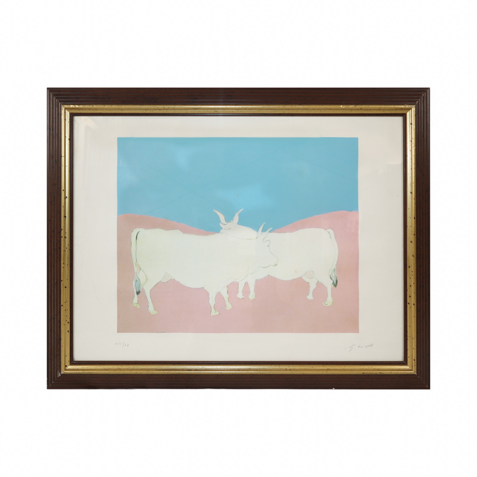 Giuseppe Cesetti (Tuscania 1902 - Tuscania 1990) - Figure di animnali su sfondo nei toni rosa e celeste Firmato al fronte in basso a destra e numerato XVII / XX Firmato al fronte in basso a destra e numerato XVII / XX