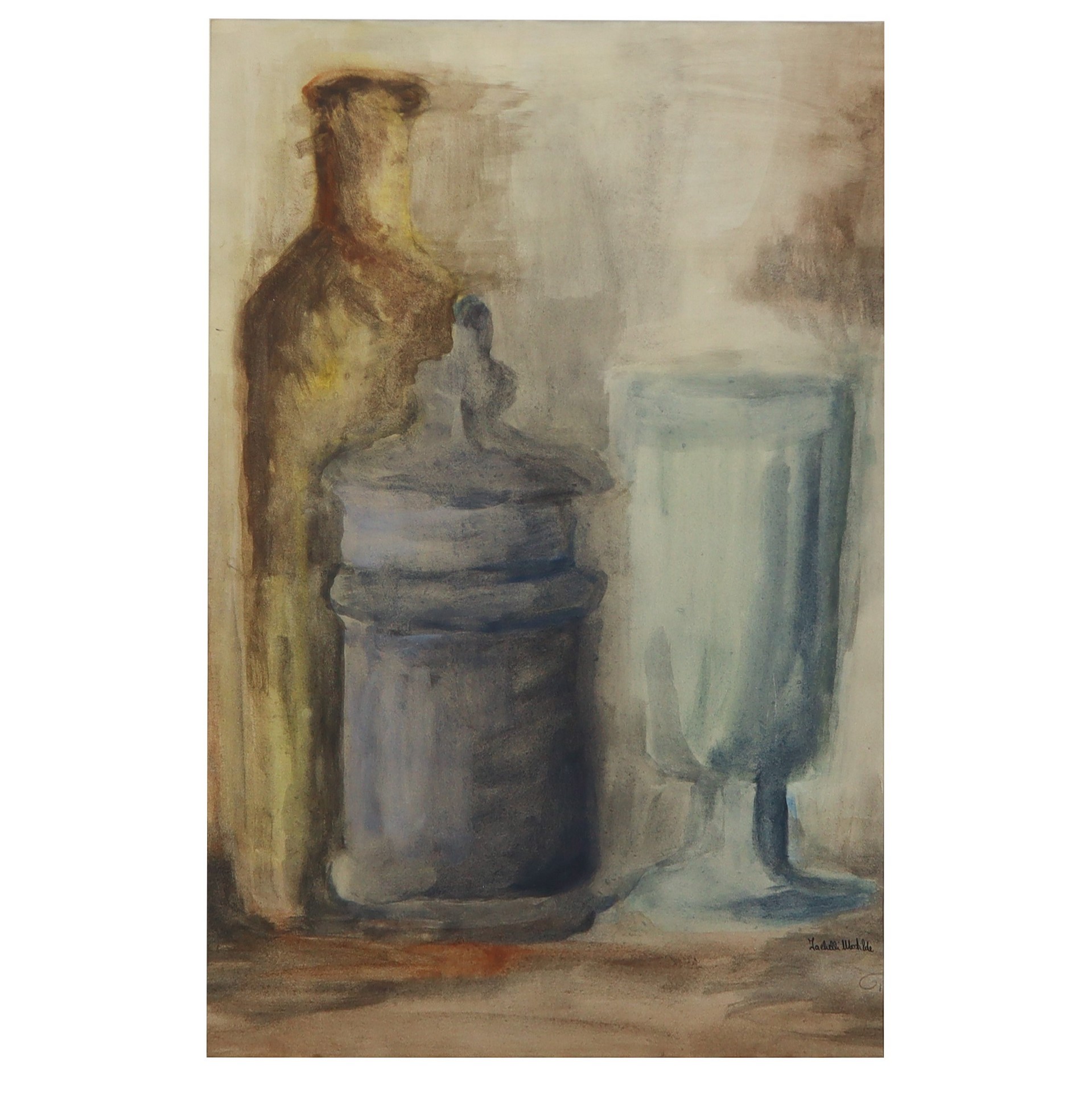 Matilde Iachelli (Francofonte 07/09/1946 - 2025) - Natura morta, bottiglia vaso e bicchiere 46 x 35 in cornice 59 x 48 cm Acquerello Matilde Iachelli è una pittrice nata a Francofonte (Siracusa) che studiò pittura a Catania con Silvio Signorelli, ed Elio Romano.