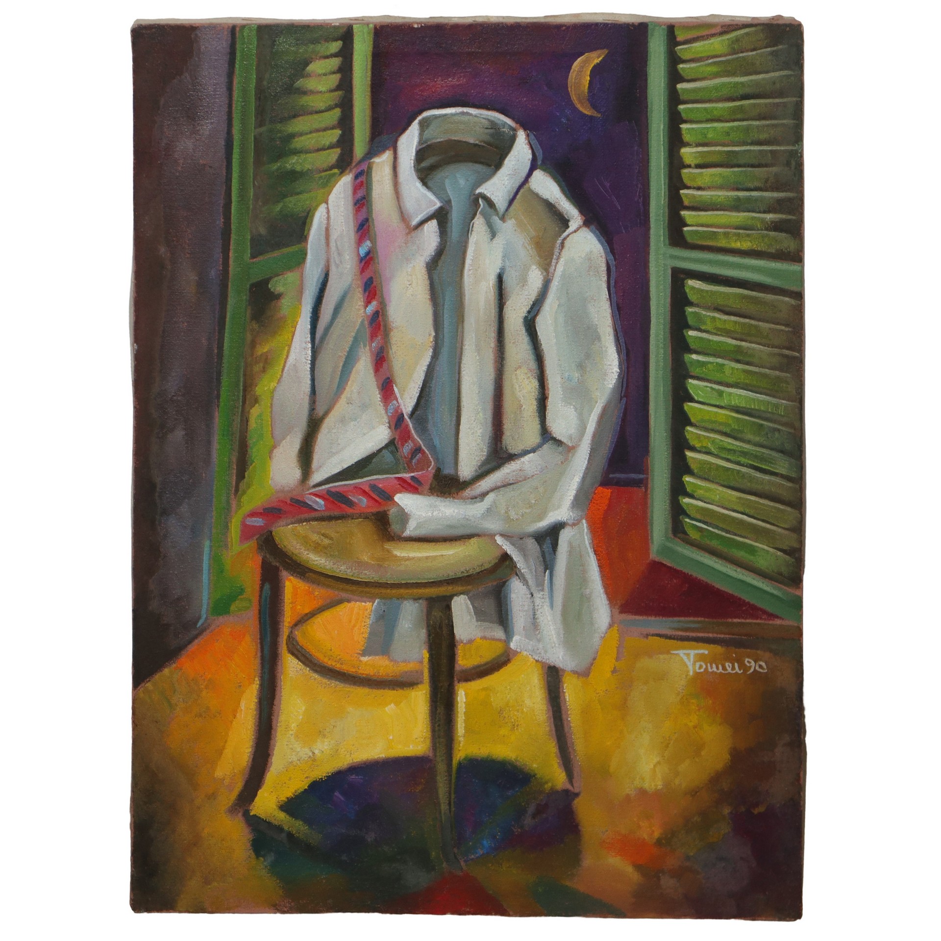 Francesco Tomei (Roma) - Camicia e cravatta alla sedia, 1990 H cm 40x30 Olio su tela Firmato sul lato destra. Firmato e datato al retro, timbro Tartaglia Arte. Opera sprovvista di cornice