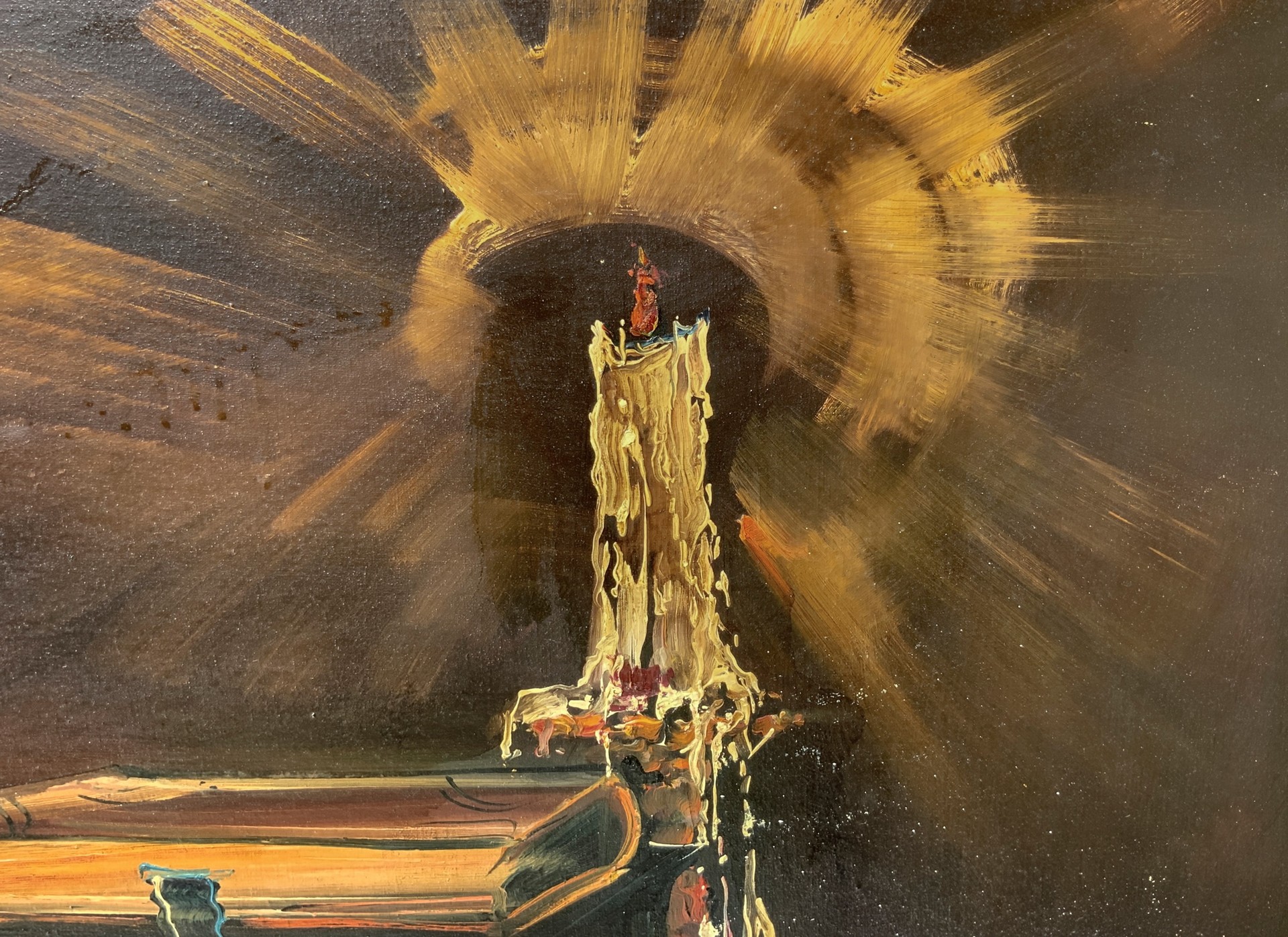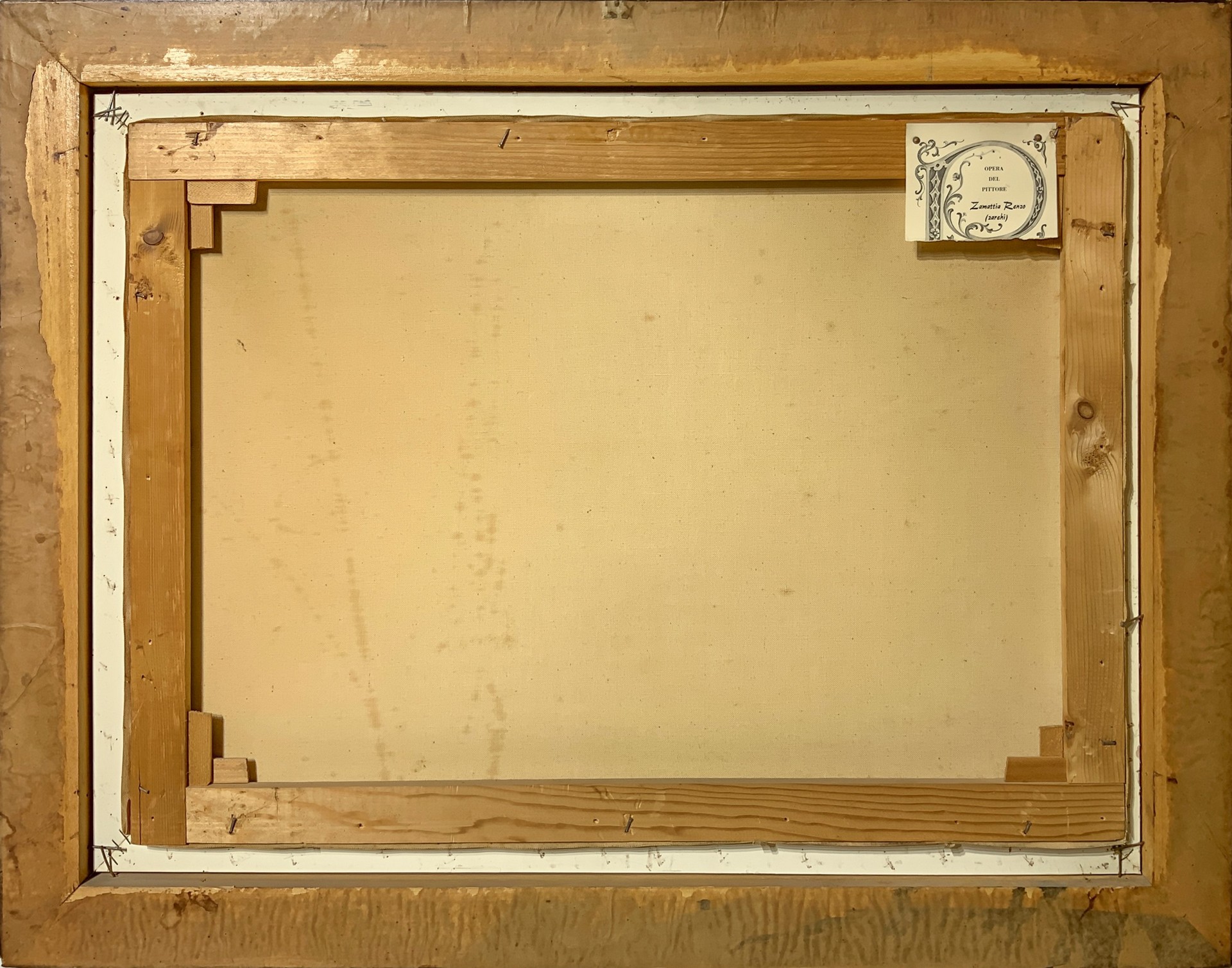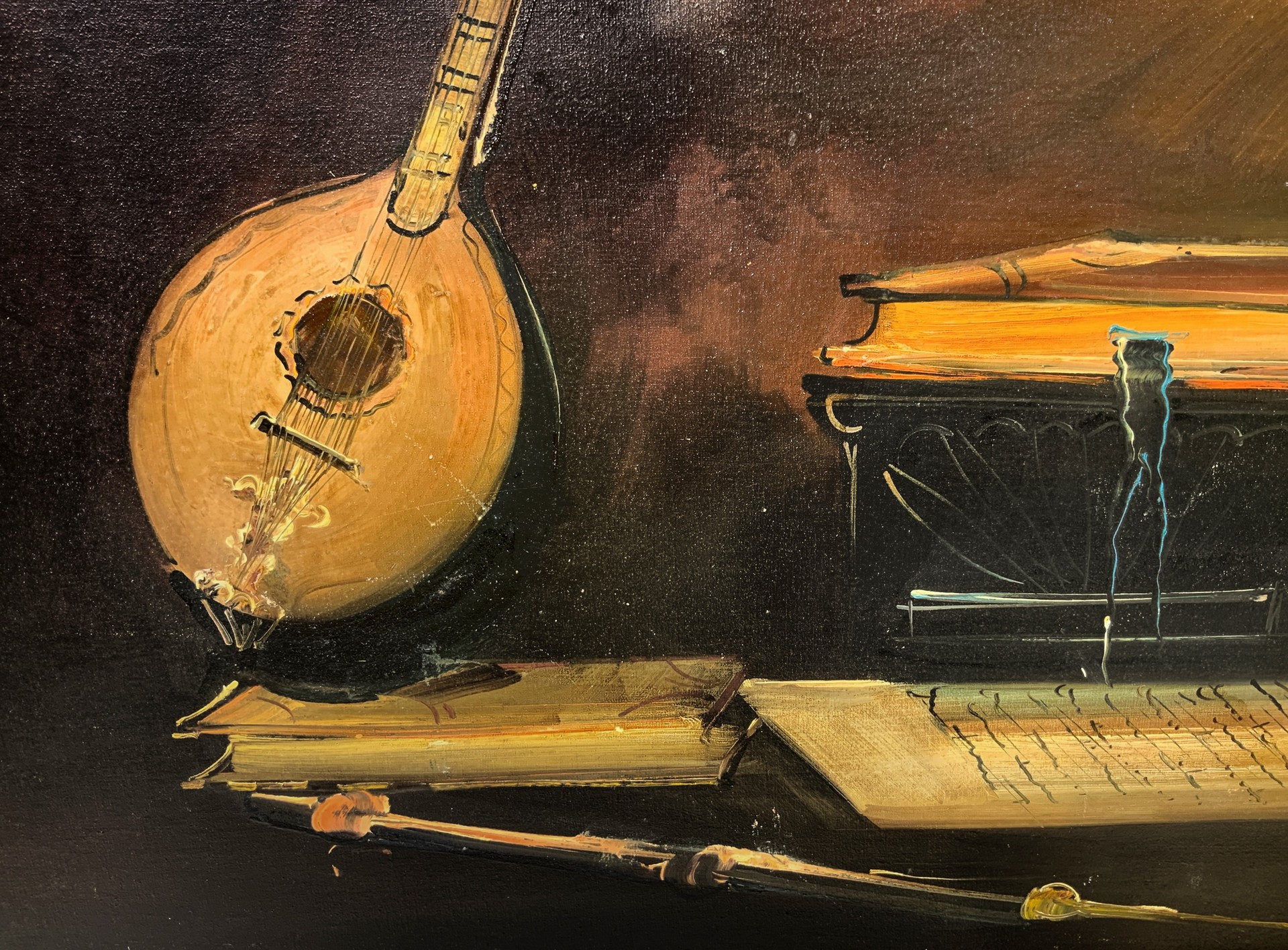 Natura morta di strumenti musicali e libri, 20° secolo 60x90 cm, in cornice 80x110 cm Dipinto ad olio su tela Firmata in basso a destra A.Rossi. Etichetta al retro.