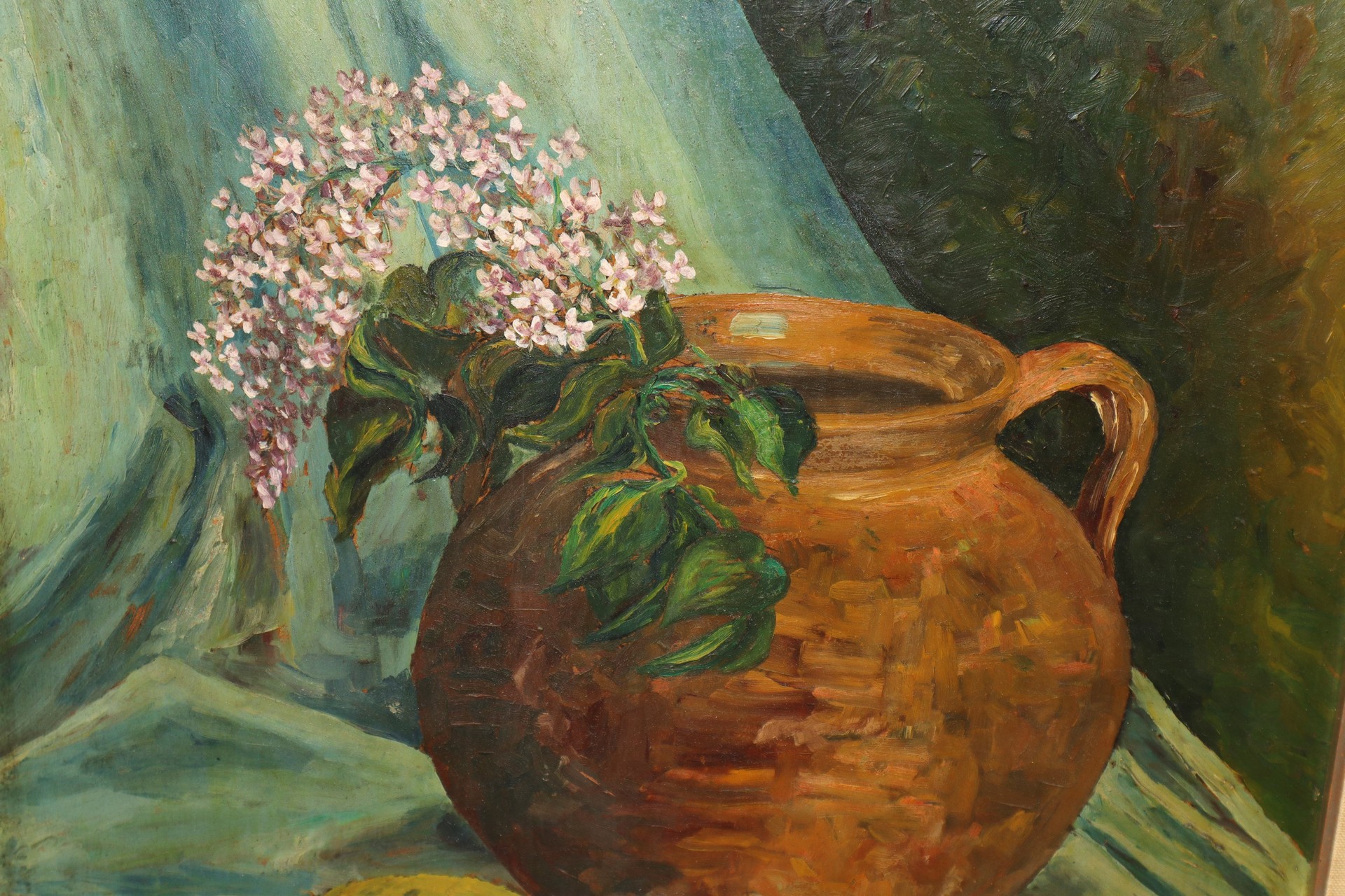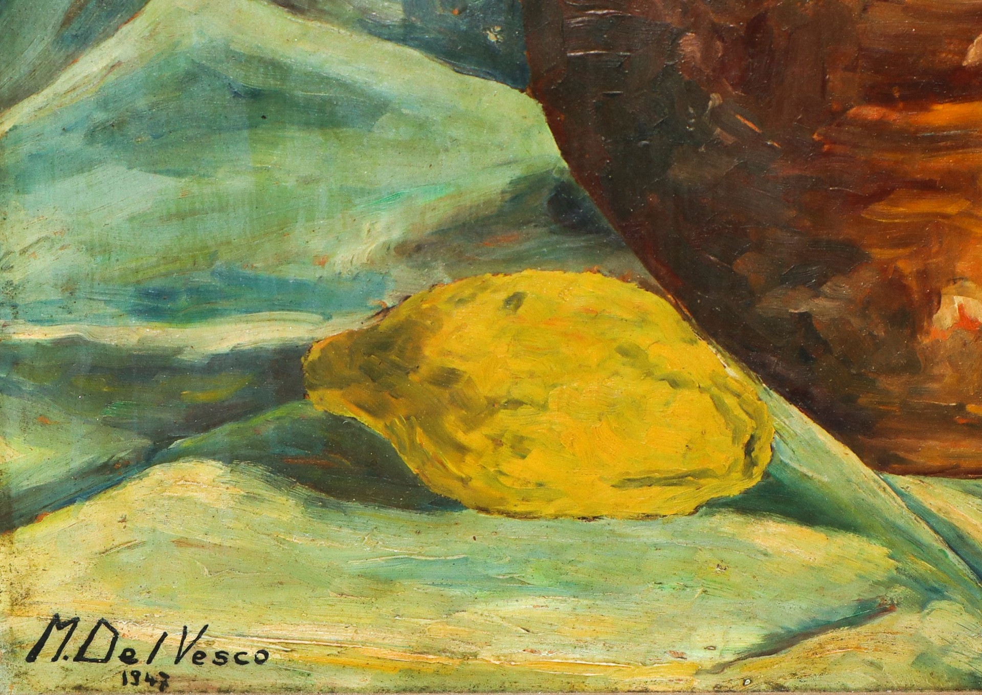 M. del Vesco, Natura morta con limoni, 1947 H cm 50x45 - in cornice H cm 63x59 Olio su masonite Firmato in basso a sinistra