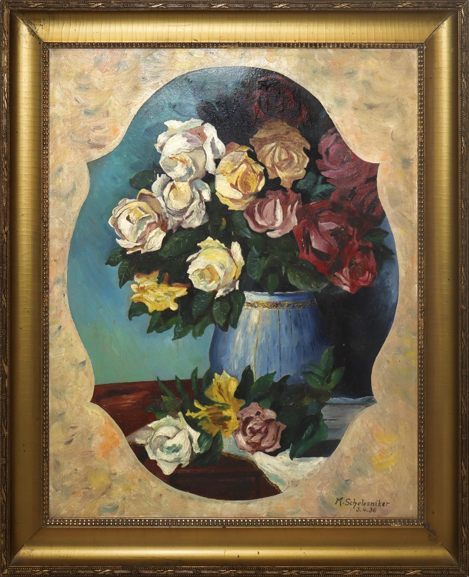 Vaso con rose cm 50,5 x cm 42; in cornice cm 59 x cm 50 olio su cartoncino Firmato M.Schelesniker e datato 3-4-36