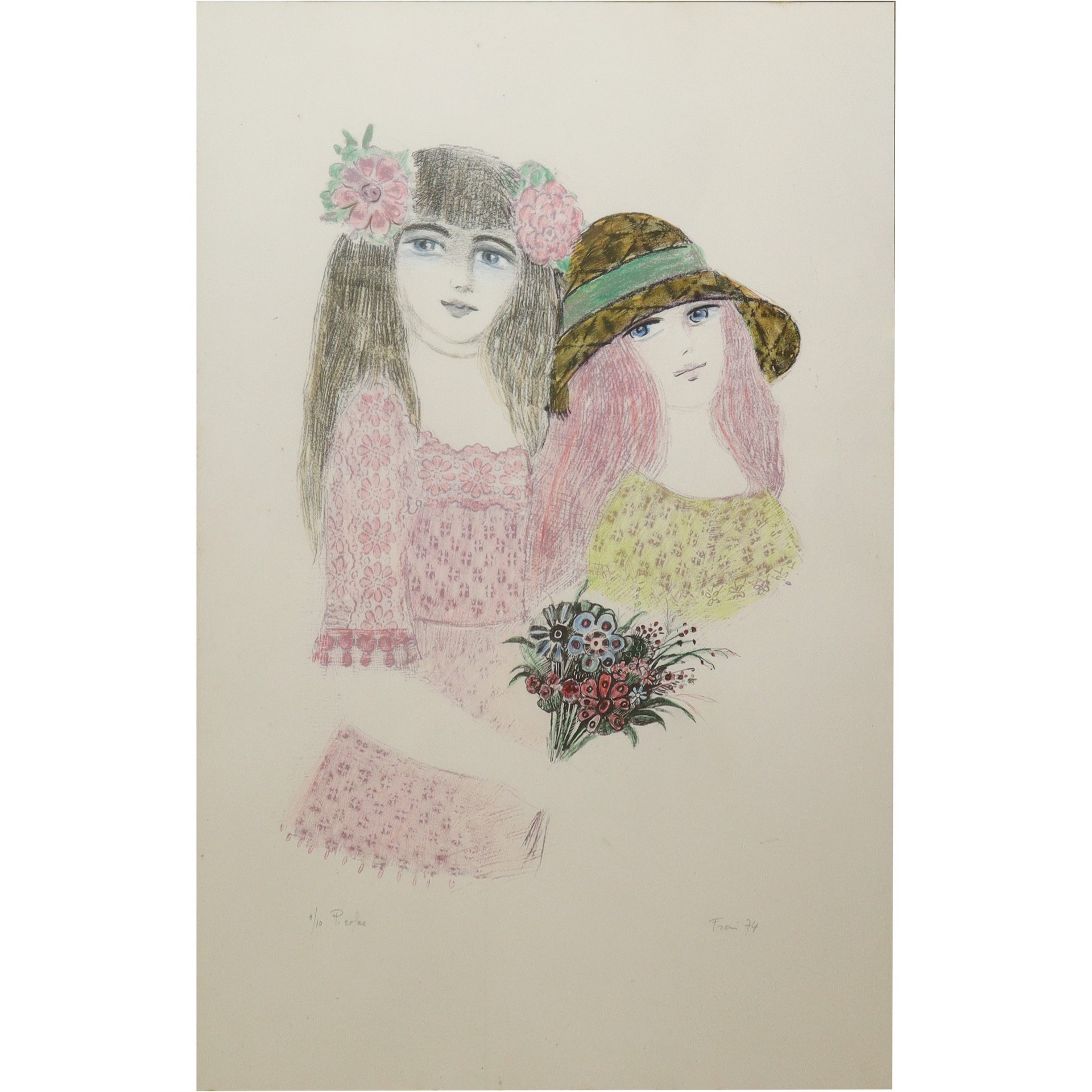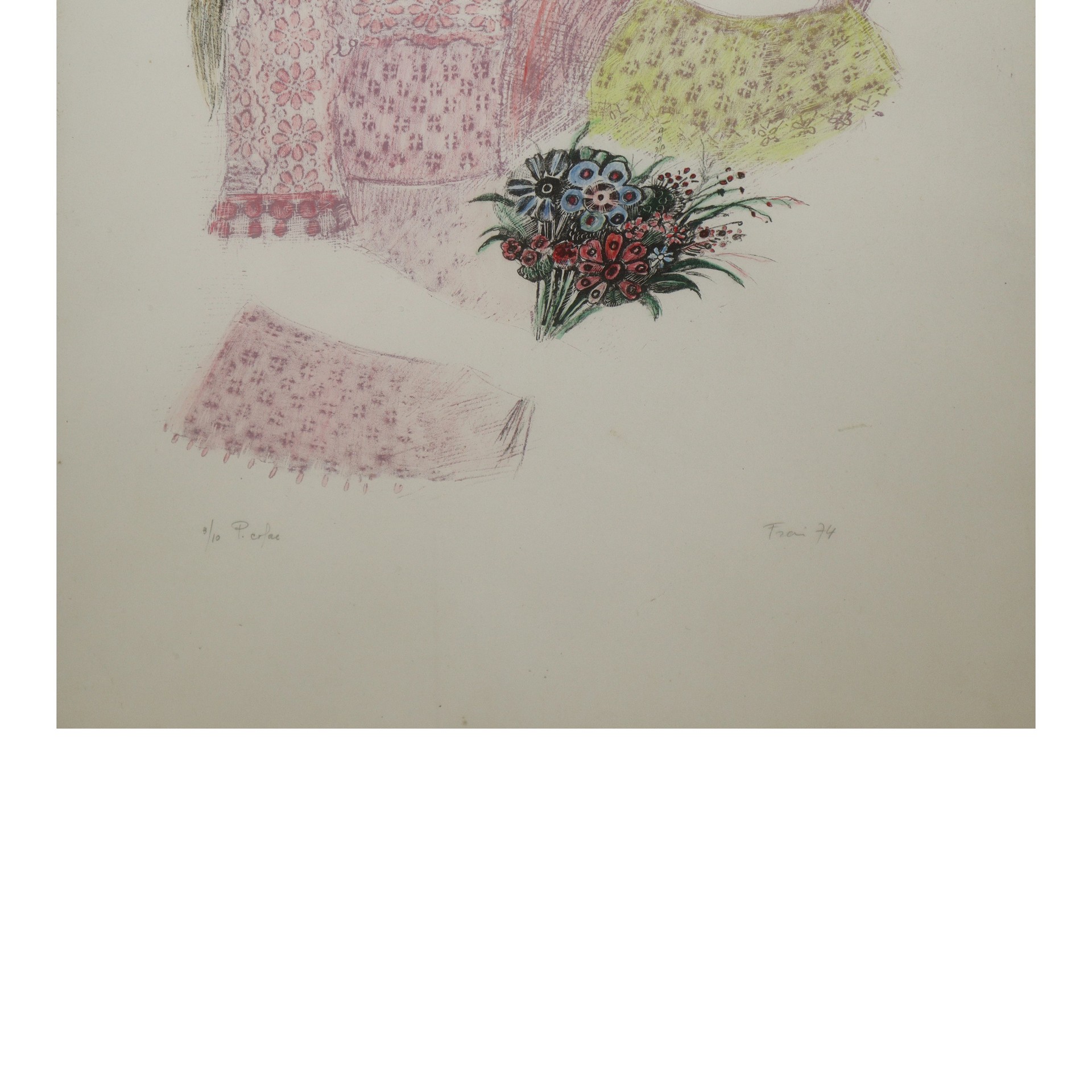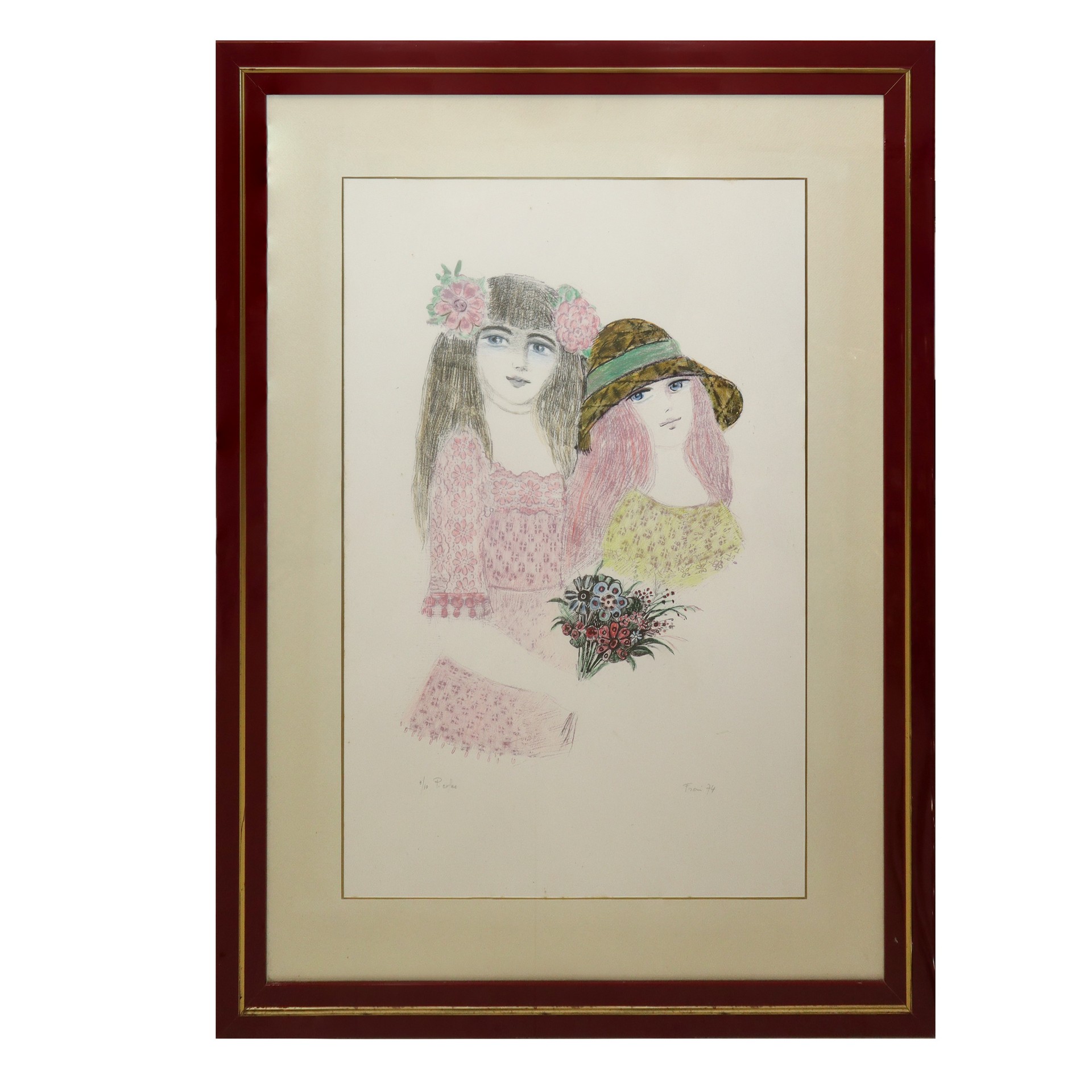Due giovani col cappello, 1974 h cm 66X46 in cornice h cm 91X71 litografia acquerellata Litografia firmata Frai e datata