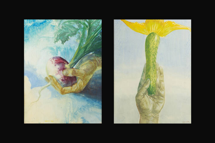 ABACUC (Silvano Gilardi)<BR>Torino 1933 - 2021<BR>Lotto di due dipinti:<BR>A) "Ecco lo zucchino (serie ortaggi mantenuti)" agosto 1972<BR>B) "Una...rapa (serie ortaggi mantenuti)" agosto 1972