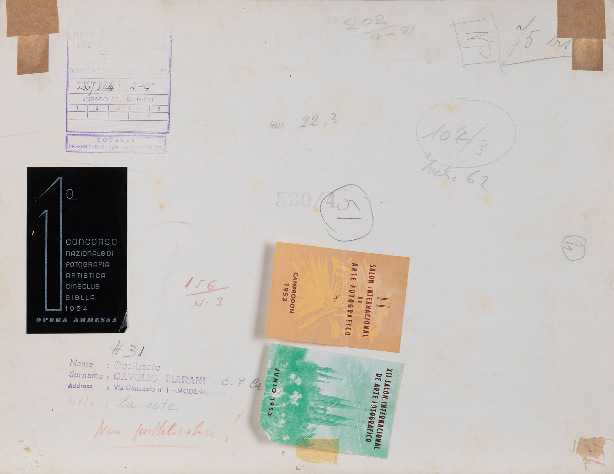 timbro del fotografo al retro, titolata a matita al retro, etichette di concorsi ed esposizioni fotografiche al retro