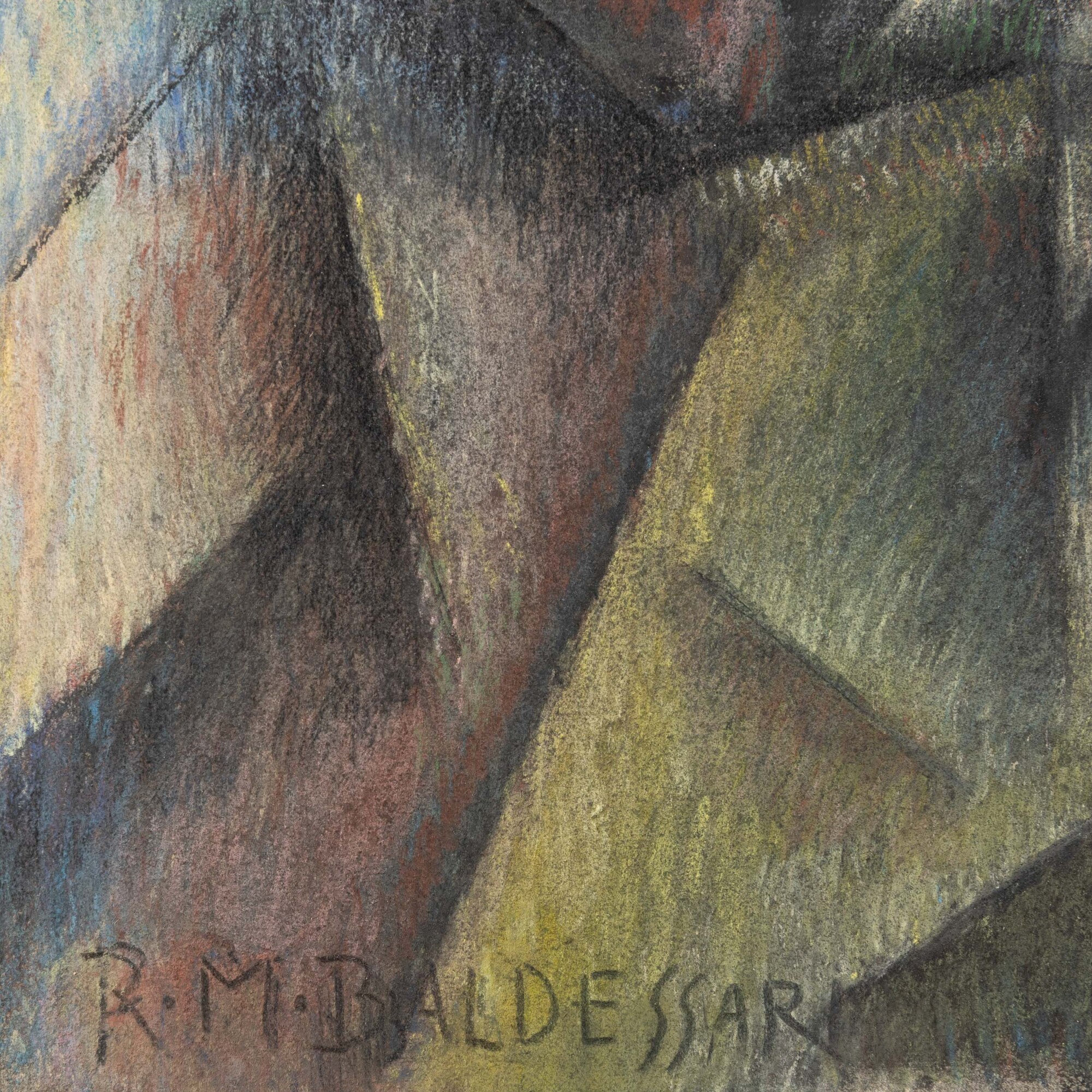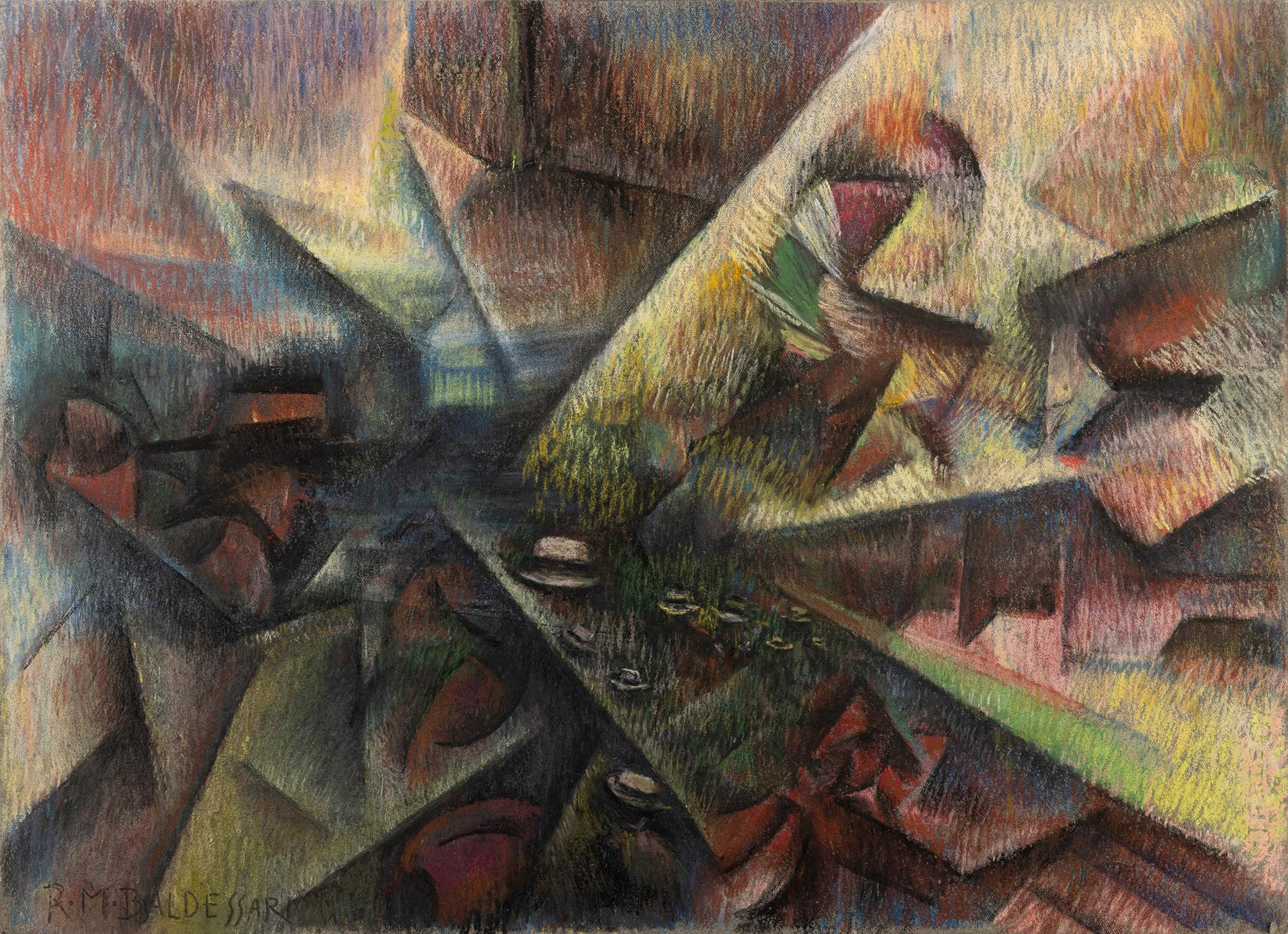 Opera registrata presso l'Archivio Unico per il Catalogo Generale delle opere futuriste di Roberto Marcello Baldessari, Rovereto con il n. B16-36 in data 16 ottobre 2023 e accompagnato da certificato di autenticità, , Già Esterina Marchesini, Padova, Collezione privata, Opera di notevole complessità compositiva ed anche di particolari scarti cromatici. Tutto il resto è un interessante esercizio di compenetrazioni di forme a suggerire, appunto, quell'idea di 'simultanietà' indicata nel titolo., (dal testo di archiviazione di Maurizio Scudiero),