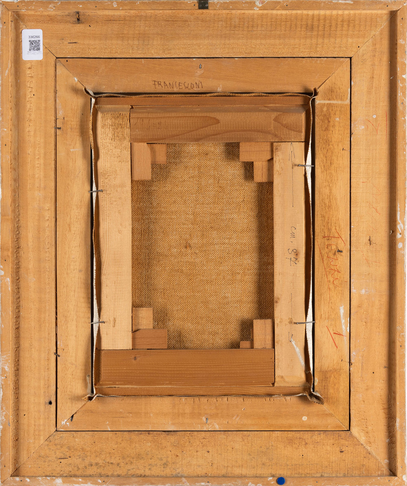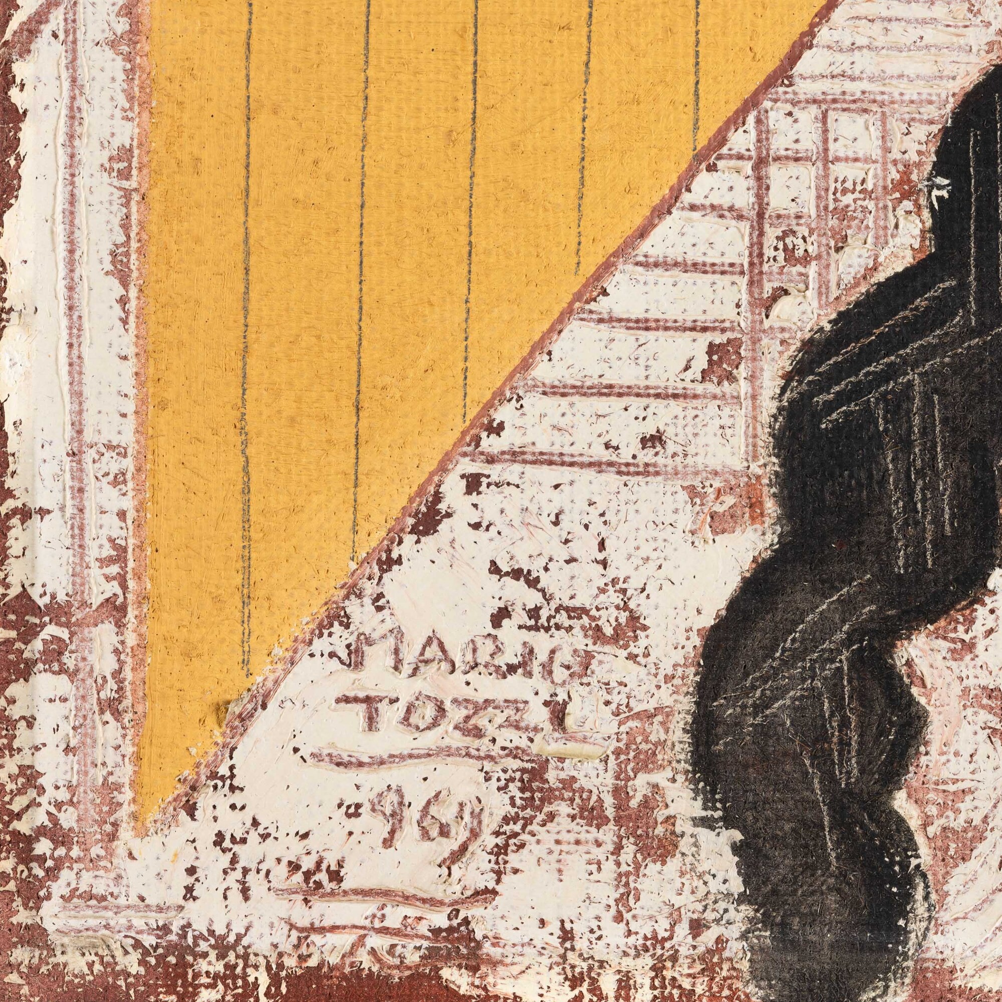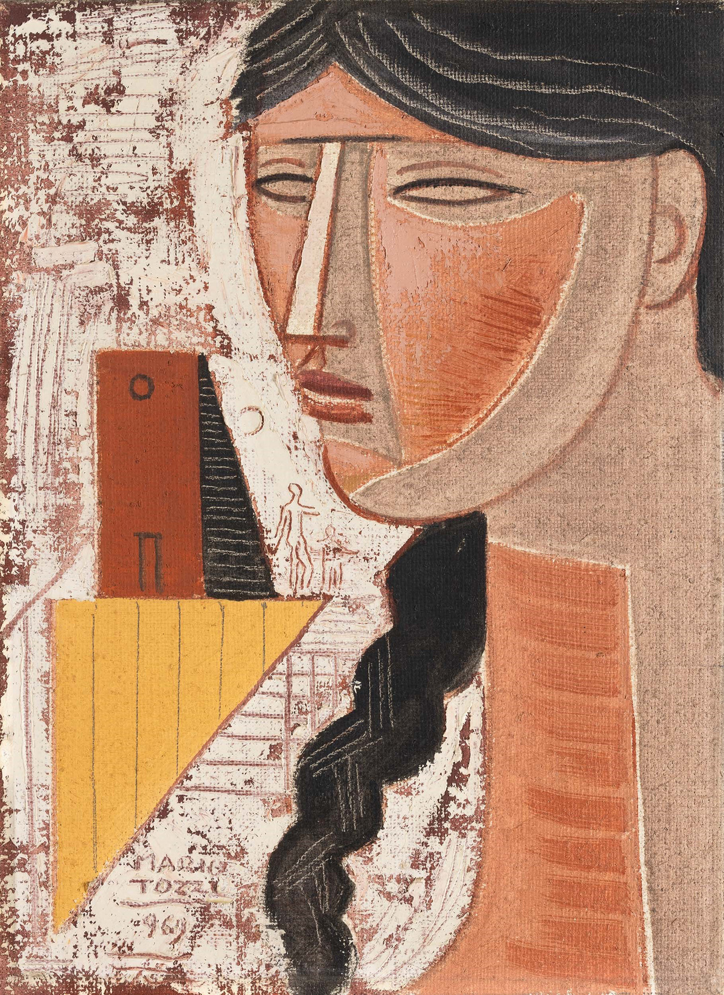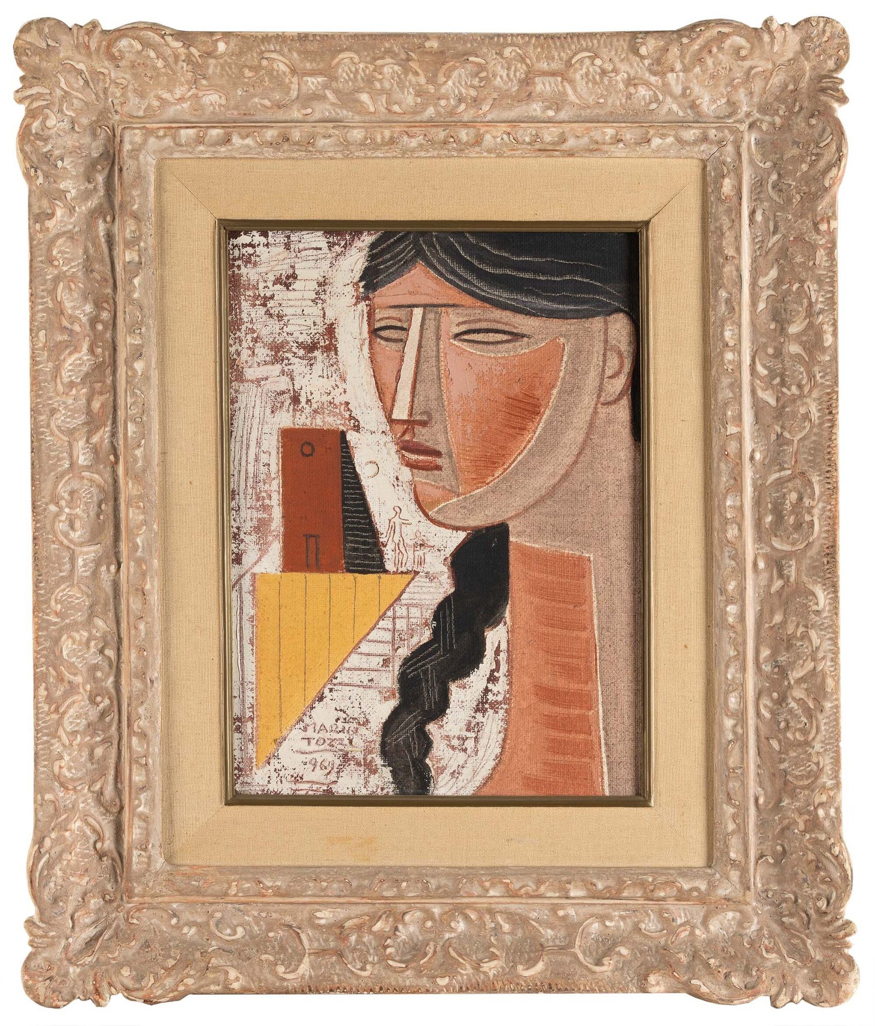 L'opera è registrata presso l'Archivio Tozzi, Foiano della Chiana con il n. 2506 in data 9 giugno 2025 e accompagnata da certificato di autenticità, Collezione privata, Monza e Brianza, L'opera del 1969 si inserisce nella fase matura di Mario Tozzi, caratterizzata da una figurazione essenziale, sospesa tra classicità e astrazione. La figura umana è centrale, ma assume i tratti di un'icona fuori dal tempo, influenzata dall'arte etrusca, romana e mediterranea. Il volto rappresentato sembra appartenere tanto a una statua quanto a un ricordo, diventando un archetipo. La composizione unisce solidità e poesia, con volumi compatti e un disegno lirico. Architetture e figure in miniatura si intrecciano con la protagonista, suggerendo che l'identità si costruisce attraverso spazio, tempo e memoria., Una pittura austera, meditativa e profondamente umana., La cornice del dipinto è stata ideata e disegnata dal pittore per le sue opere ed è realizzata dal corniciaio artigiano Malerba di Milano, è intagliata in legno e patinata in gesso., (dal testo di archiviazione)