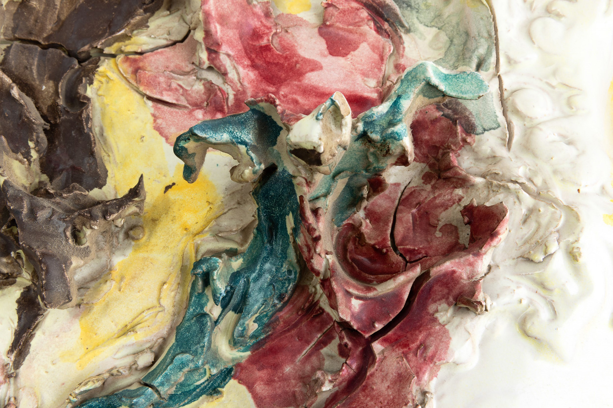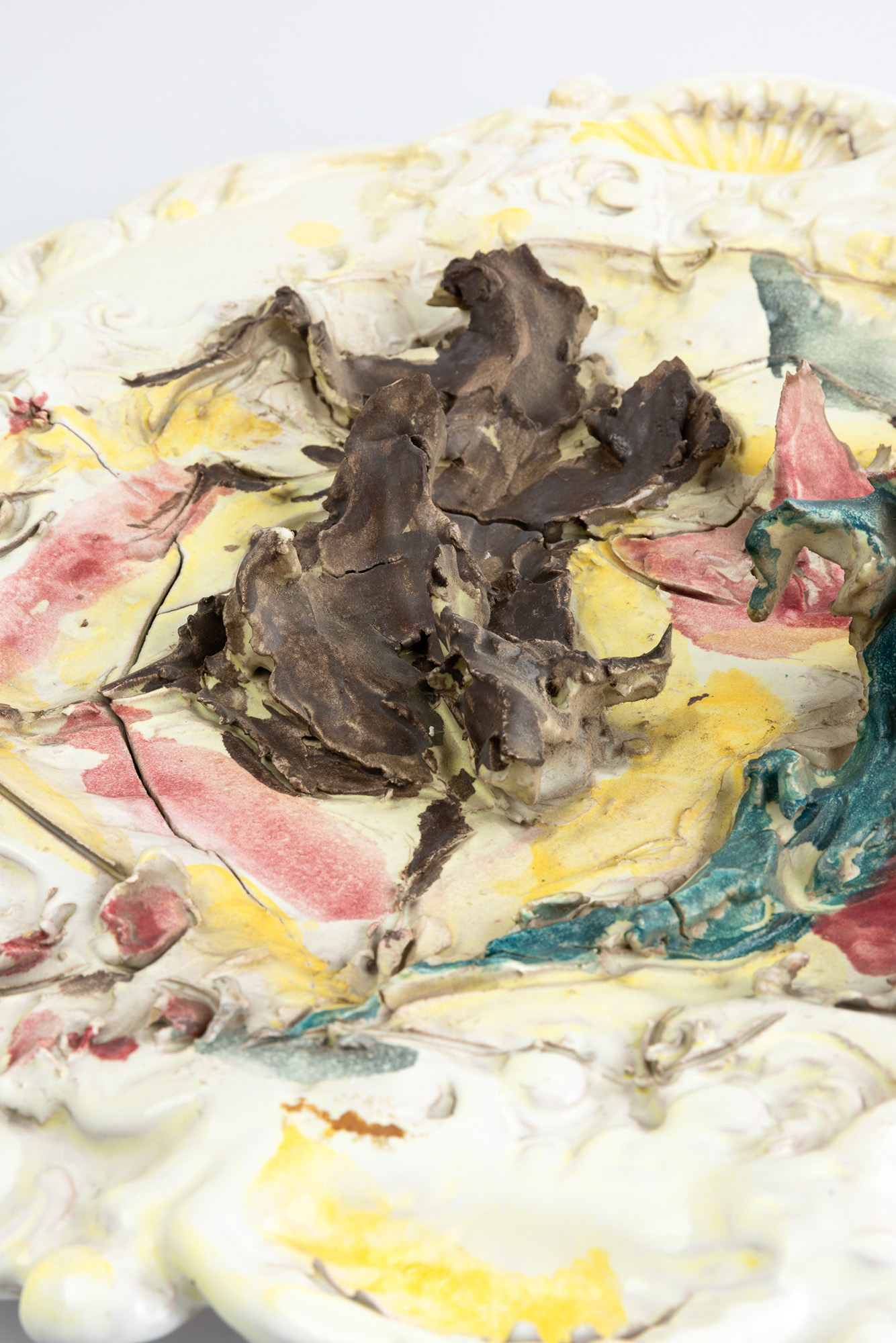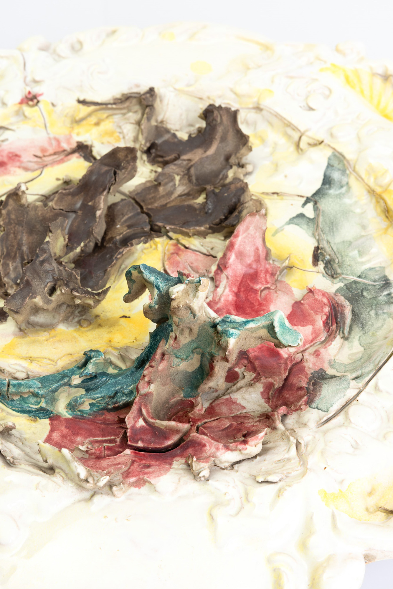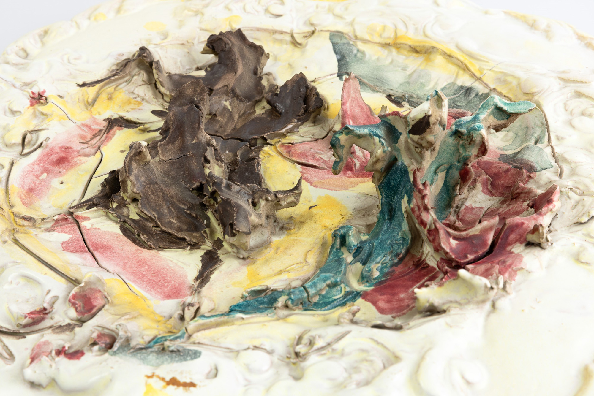 terracotta smaltata e dipinta nei colori del bianco, giallo, grigio, marrone, turchese e rosso