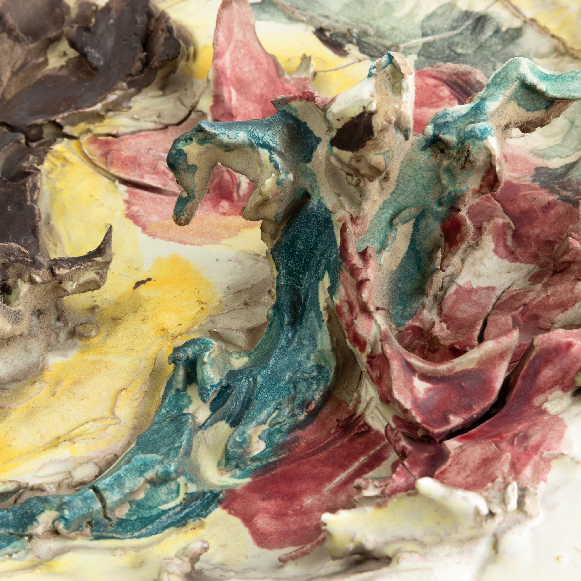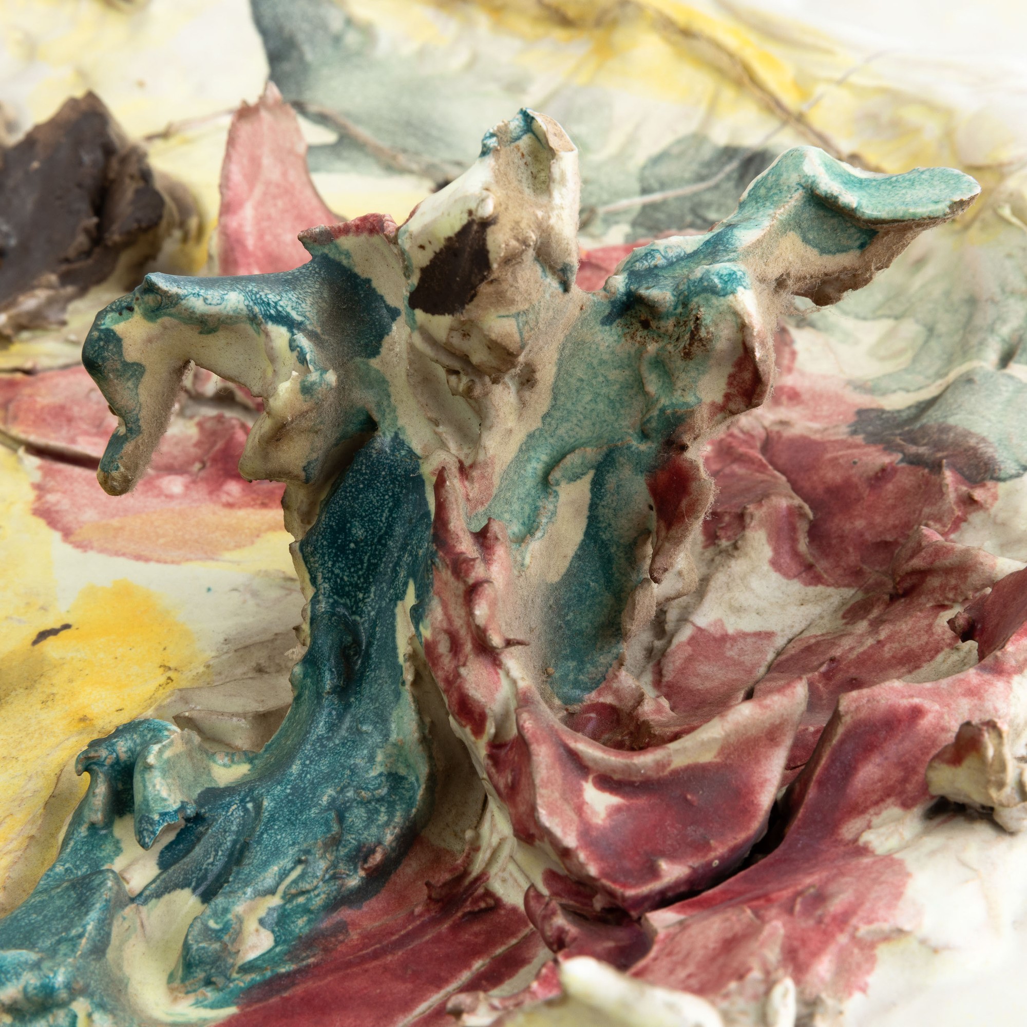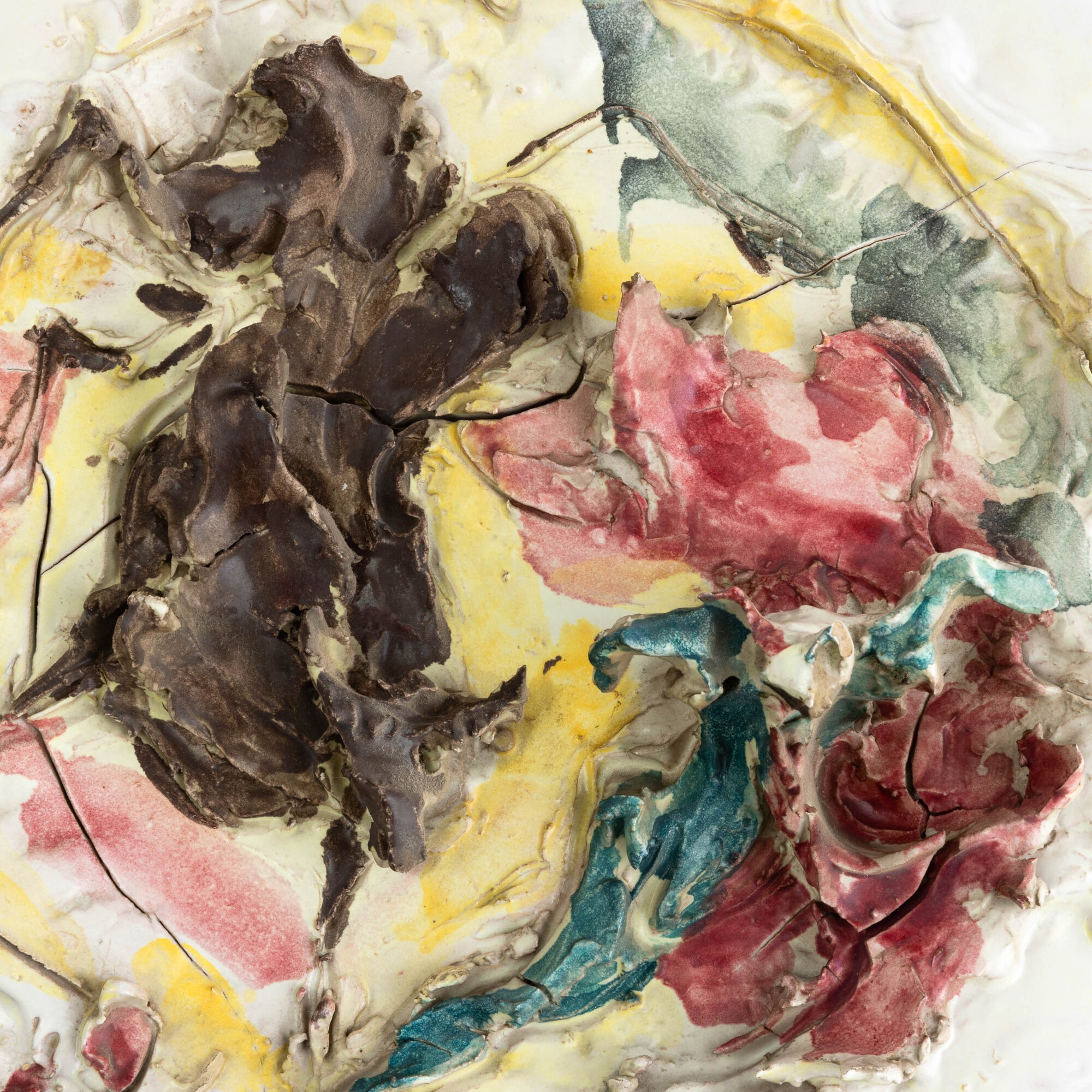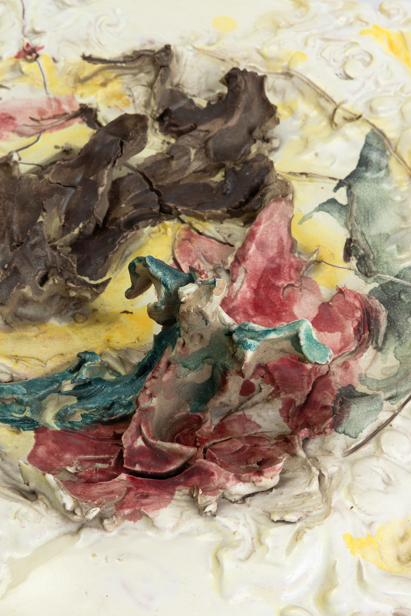 terracotta smaltata e dipinta nei colori del bianco, giallo, grigio, marrone, turchese e rosso