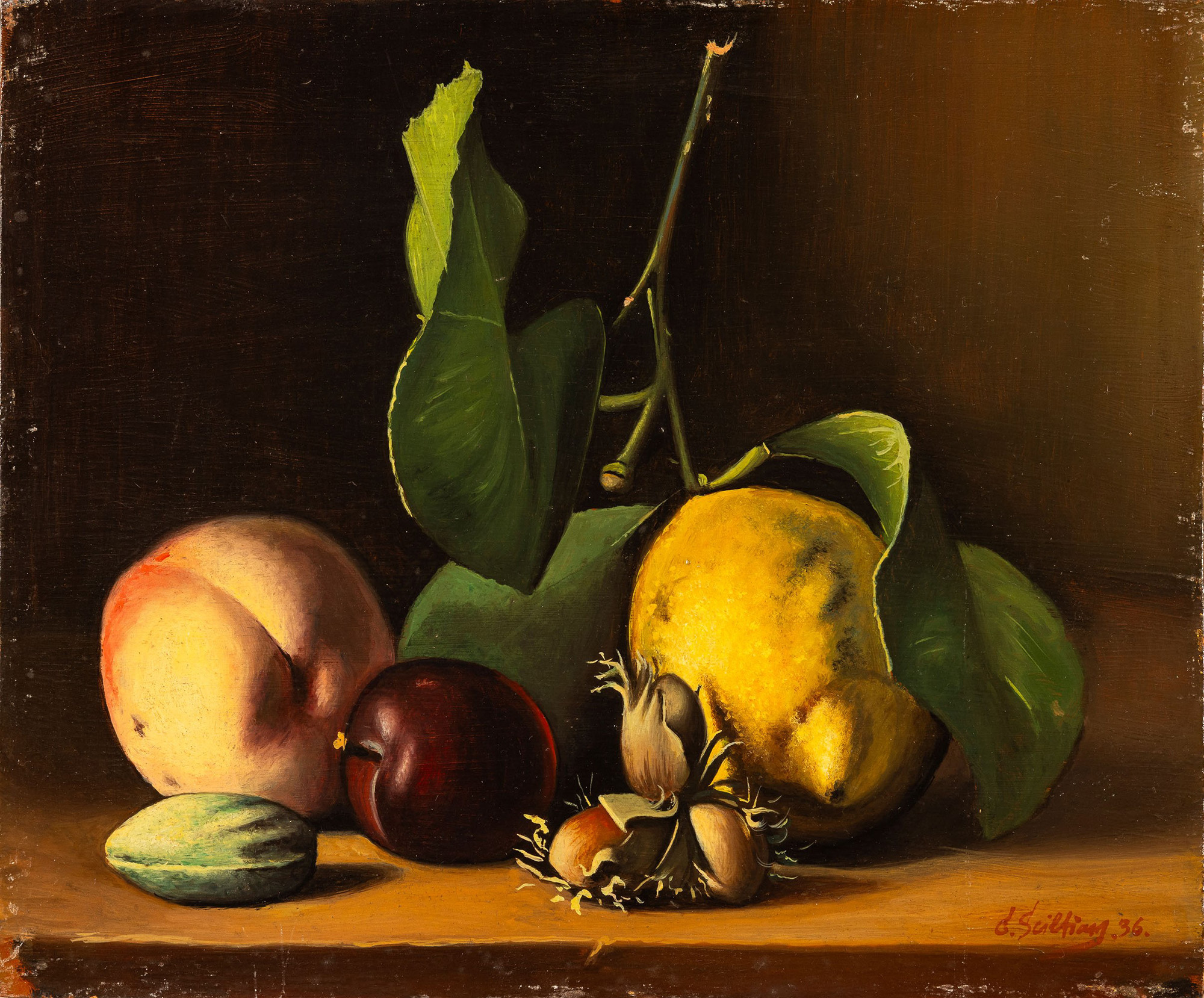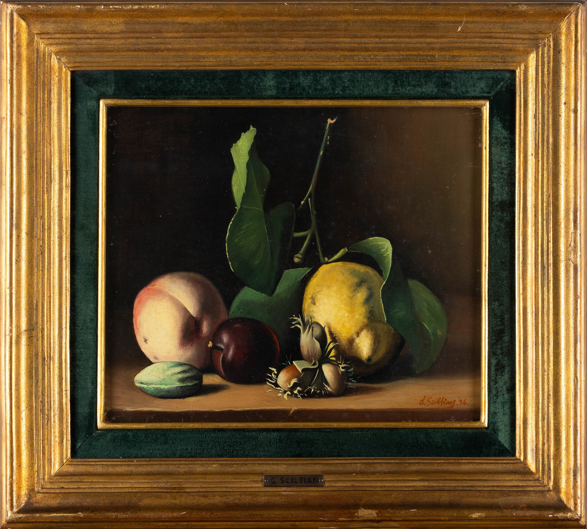 Opera accompagnata da certificato di autenticità rilasciato dal dott. Sbarbaro in data 4 giugno 2025, Collezione privata, Reggio Emilia, La qualità pittorica riscontrata è in linea con la produzione del periodo che proprio sul finire degli anni ‘30 cominciava a raccogliere i primi successi sul mercato milanese., Il primo ad accorgersi della sua tecnica pittorica tutta proiettata verso la lezione della grande pittura antica fu Roberto Longhi che nel saggio introduttivo alla prima mostra in Italia del pittore russo di origine armena alla Galleria Bragaglia di Roma nel 1926 osservava in questi termini “la veracità palmare, un portento di evidenza stiano dinanzi agli occhi dello Sciltian come metro costante della natura e della vita”. Un credo pittorico non soltanto estetico ma anche etico che si plasma attorno alla resa mimetica della realtà e a un diligente riferirsi ai modelli per lui imprescindibili offerti dall’eredità caravaggesca, dalla grande pittura fiamminga e da quella spagnola con una riflessione particolare per gli eccellenti esempi espressi da Zurbarán e da Velázquez. [...], Questa natura morta si inserisce nel nucleo cospicuo di opere realizzate in quegli anni con soggetto analogo in cui l’artista declina la composizione con frutta sistemate su un ripiano in legno, talvolta su di un panno di colore verde e rosso. Da segnalare come in questo caso venga rappresentato il frutto del limone, ancora attaccato al suo ramo con le foglie, assoluto protagonista di questo lavoro plasmato dalla luce al punto che gli oggetti sembrano rivelarsi dall’oscurità. [...], (dal testo di archiviazione di Stefano Sbarbaro),