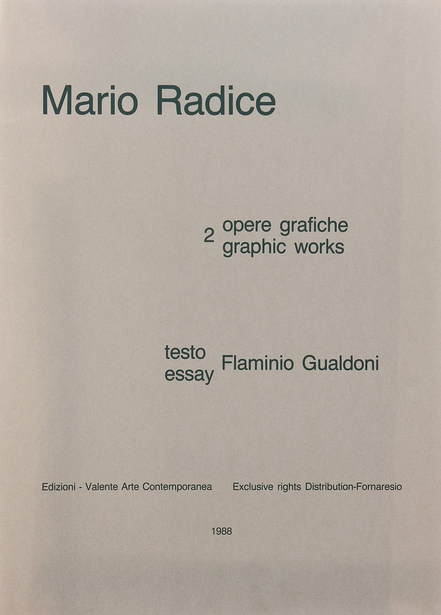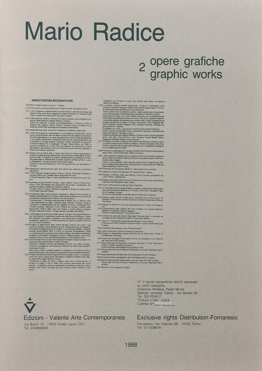 RADICE MARIO (1898 - 1987) Mauro Radice (cartella). 1988. Serigrafia. Cm 50,00 x 70,00. Cartella completa contenente n.2 serigrafie firmate e numerate dall'autore a matita. Tiratura: 100 + XXX. Edizioni Valente Arte Contemporanea, con testi di Flaminio Gualdoni. Confezione originale numerata. Esemplare: