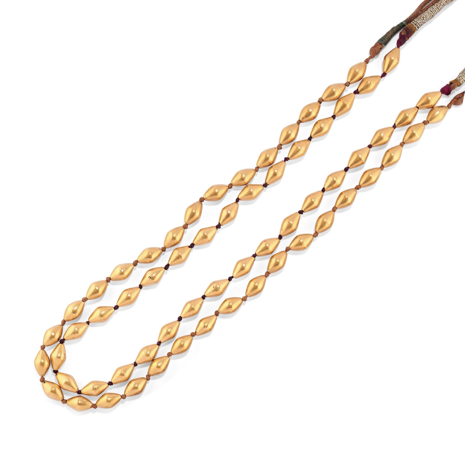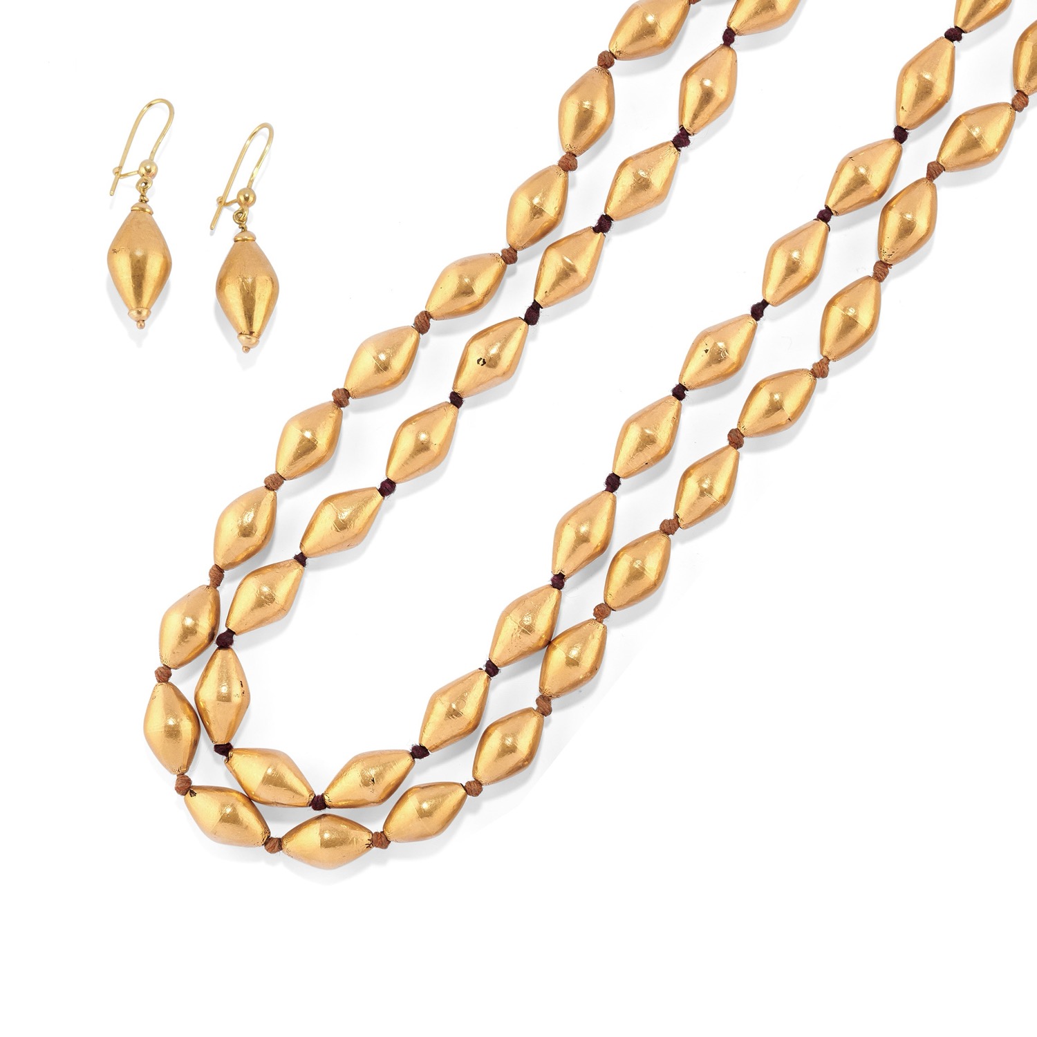 composta da due collane e un paio di orecchini chiusura a monachella, con pepite ricoperte di foglia d'oro, con cordoncino.composta da due collane e un paio di orecchini chiusura a monachella, con pepite ricoperte di foglia d'oro, con cordoncino.