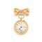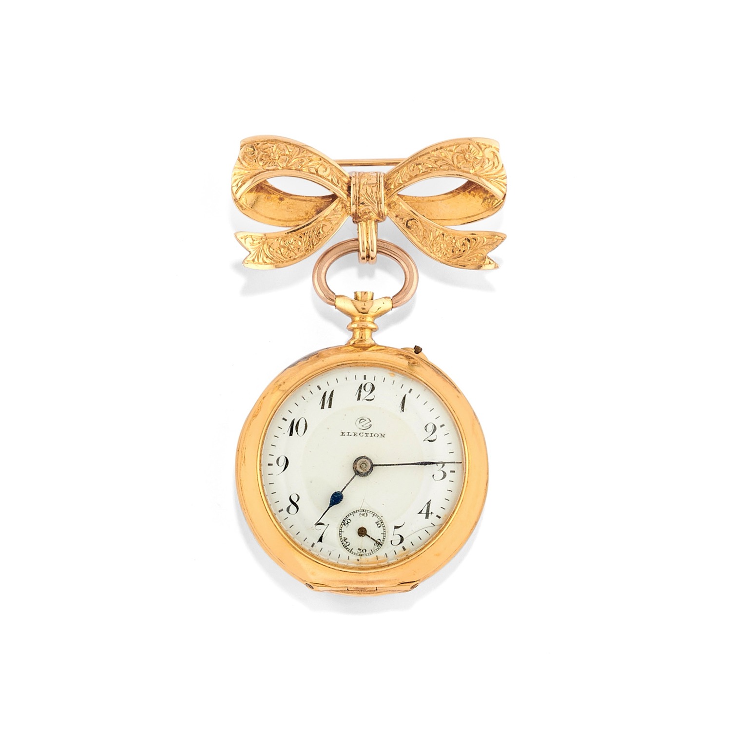 trattenuta da spilla a fiocco, cassa rotondo, quadrante chiaro, numeri arabi dipinti, secondi al sei, movimento a carica manuale, difetti (mancanze).