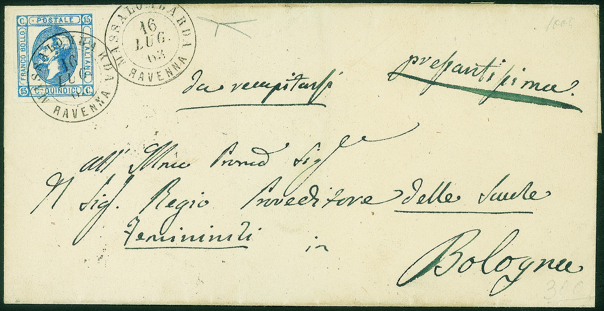 Regno - Vittorio Emanuele II - Lettera (13e)Lettera affrancata con 15 cent litografico (13e) con parziale doppia stampa da slittamento (tassello superiore) - da Massalombarda 16 LUG. 63 per Bologna - cert. Bottacchi