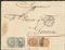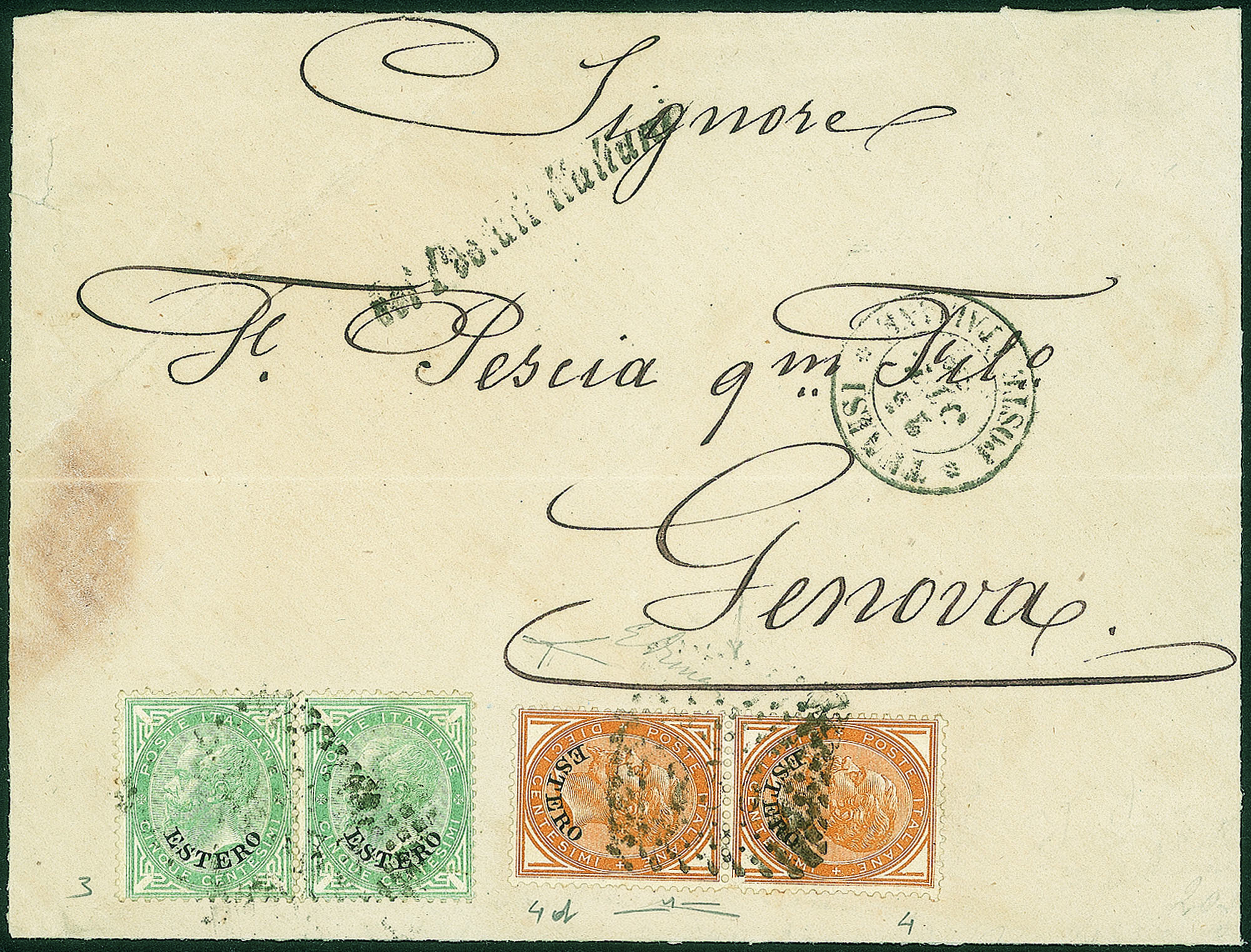 Uffici Postali all'Estero - Levante - Lettera spedita da Tunisi a Genova il 26 ottobre 1876Affrancata con 5 cent. DLR coppia sovrastampato ESTERO + 10 cent. ocra coppia verticale sovrastampato ESTERO con angolo superiore sinistro NON MODIFICATO - 5 lettere note - Rarità (Cert. Bottacchi).
