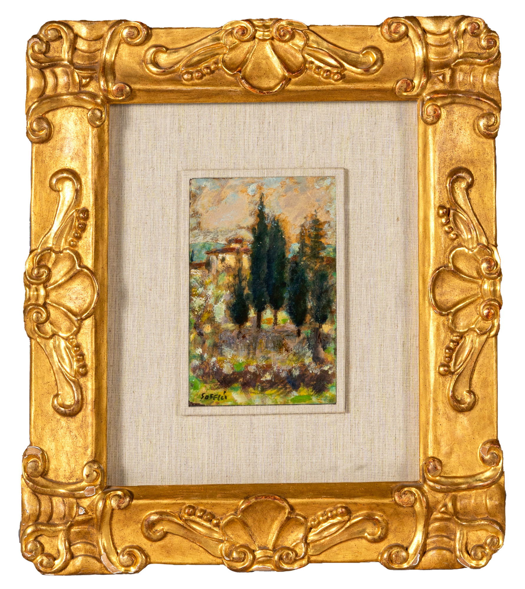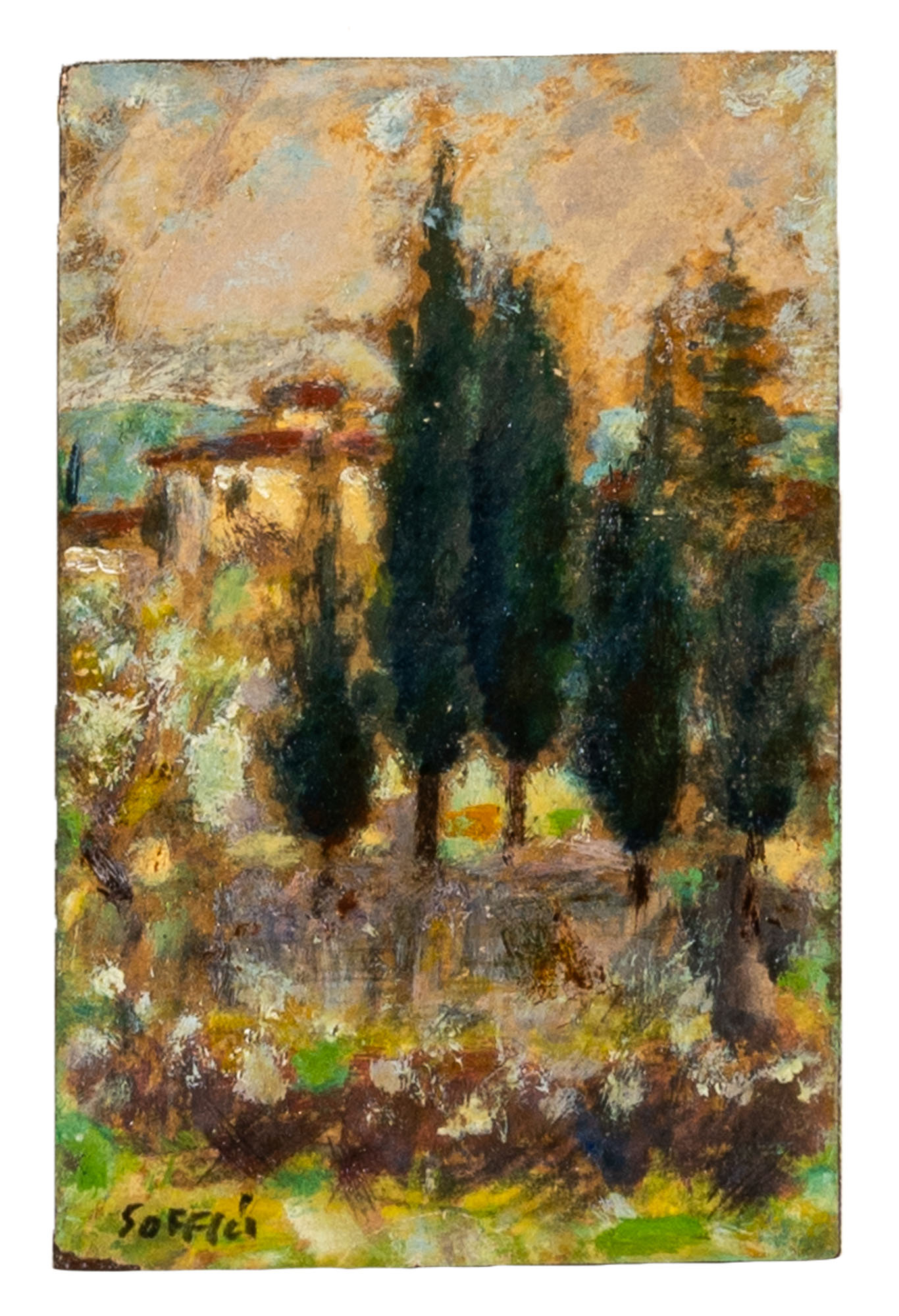 ARDENGO SOFFICI(1879 - 1964)Casa e cipressi1947 circaOlio su carta applicata su masonite20,5 x 13,5 cmFirmato in basso a sinistraOpera accompagnata da autentica su fotografia a cura di Luigi CavalloPROVENIENZA:Collezione privata, Padova