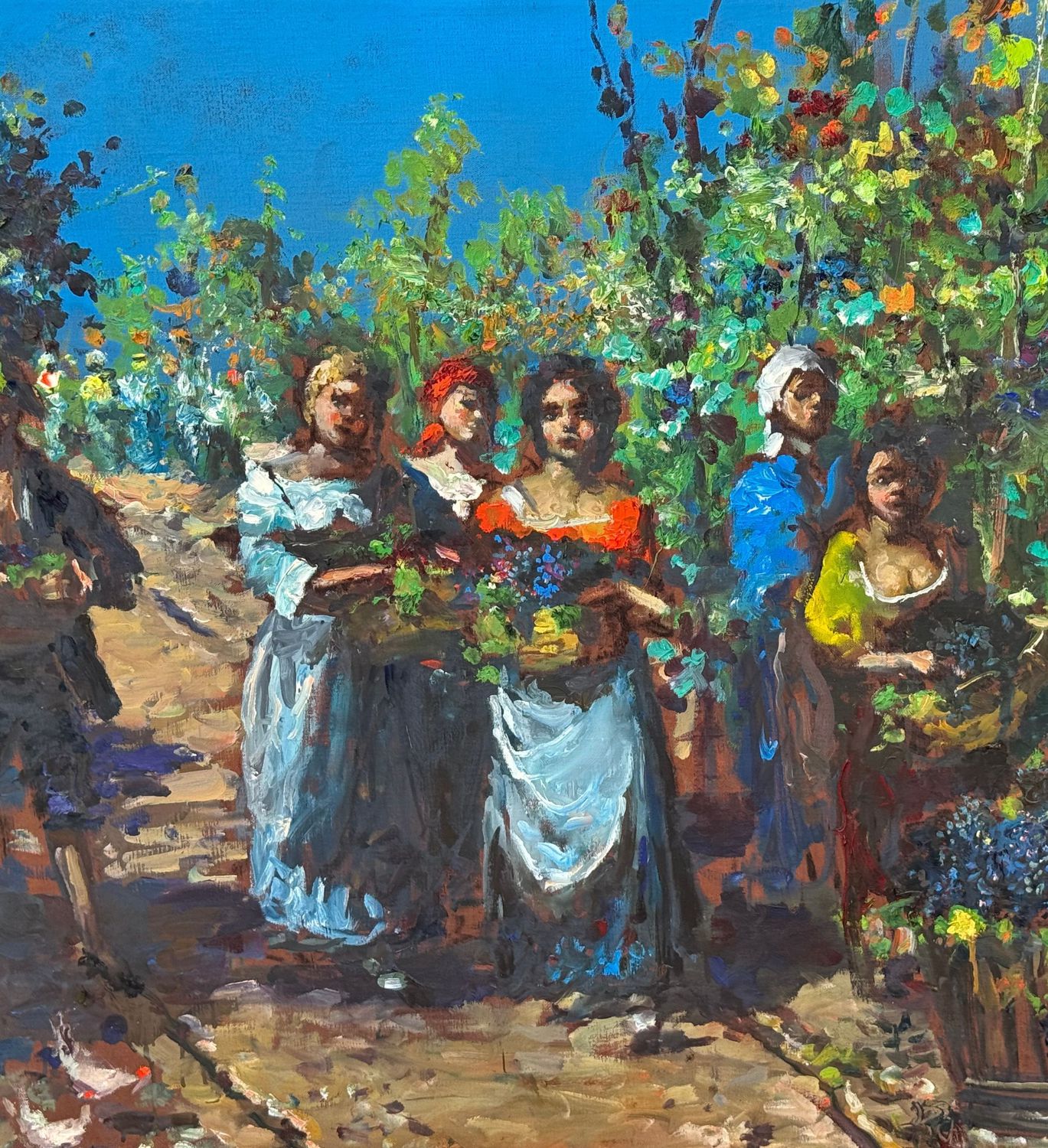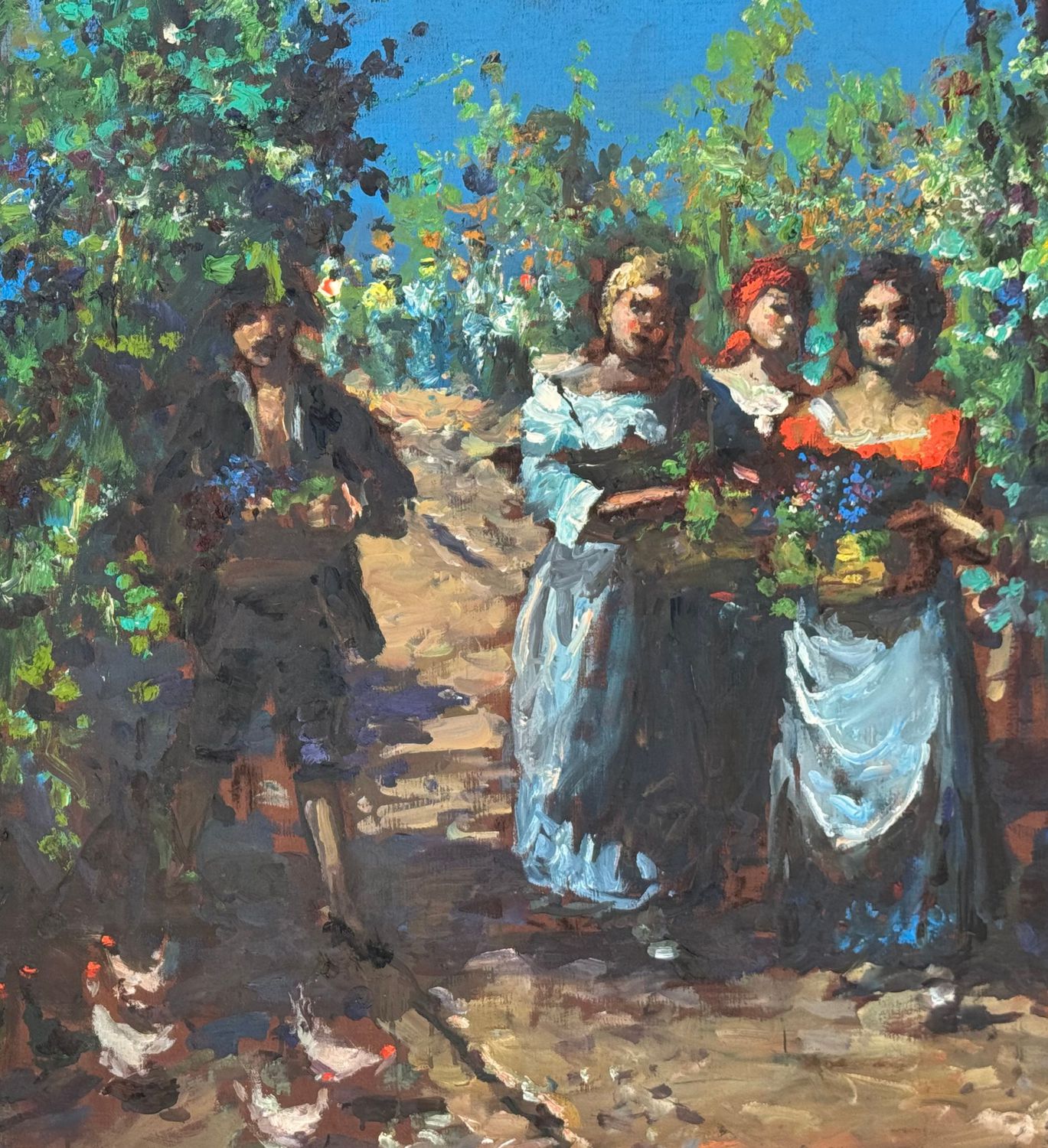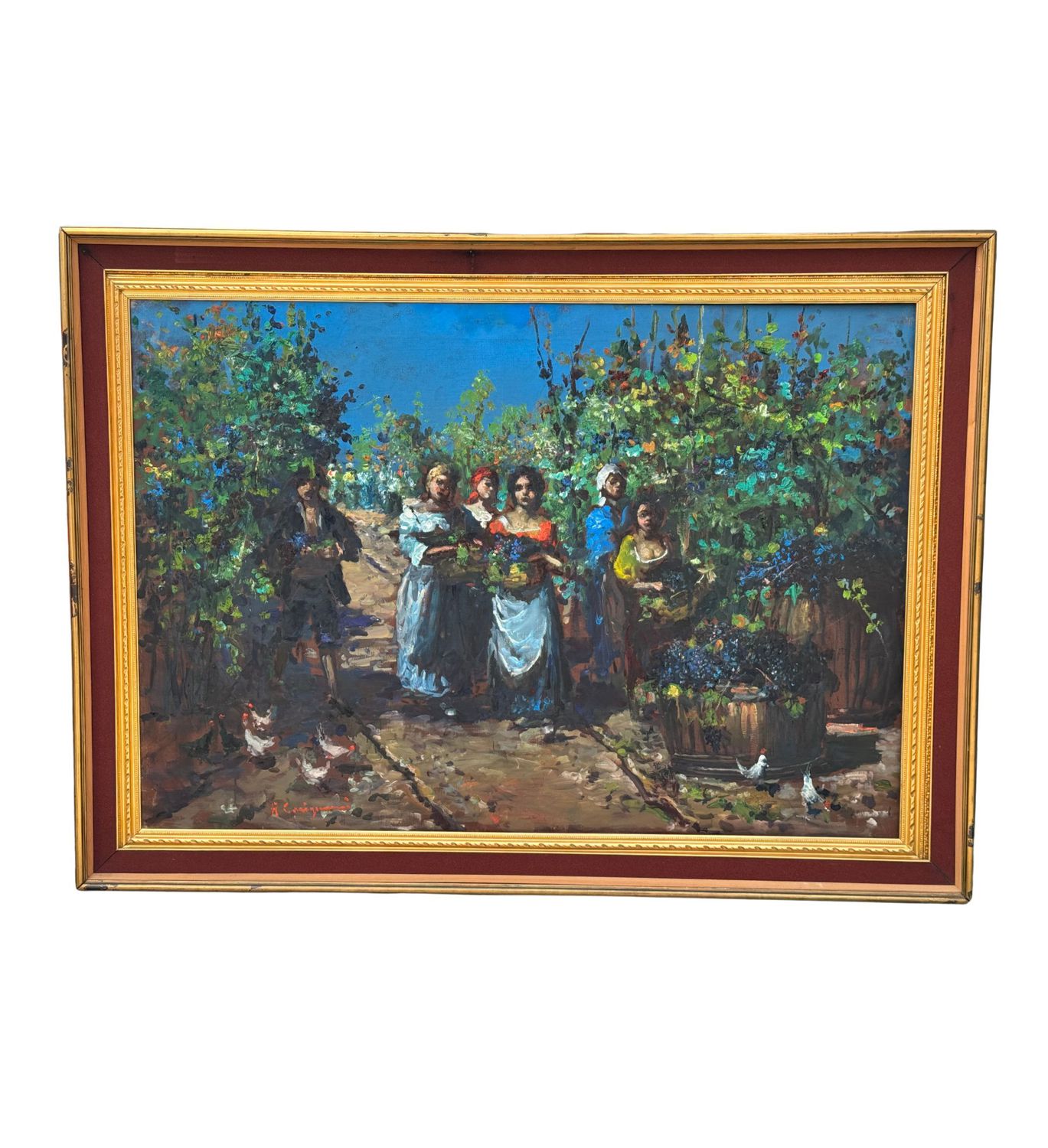 Dipinto olio su tela, periodo XX secolo scuola Italiana, raffigurante La Vendemmia. Dimensioni compreso cornice: 150x110 cm. Dimensioni interno cornice: 130x80 cm. Reca firma in basso a sinistra R. Carignani. Opera in buone condizioni.