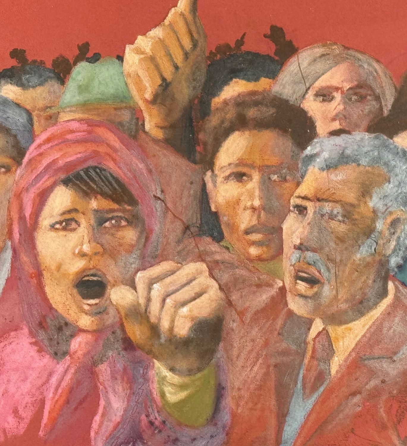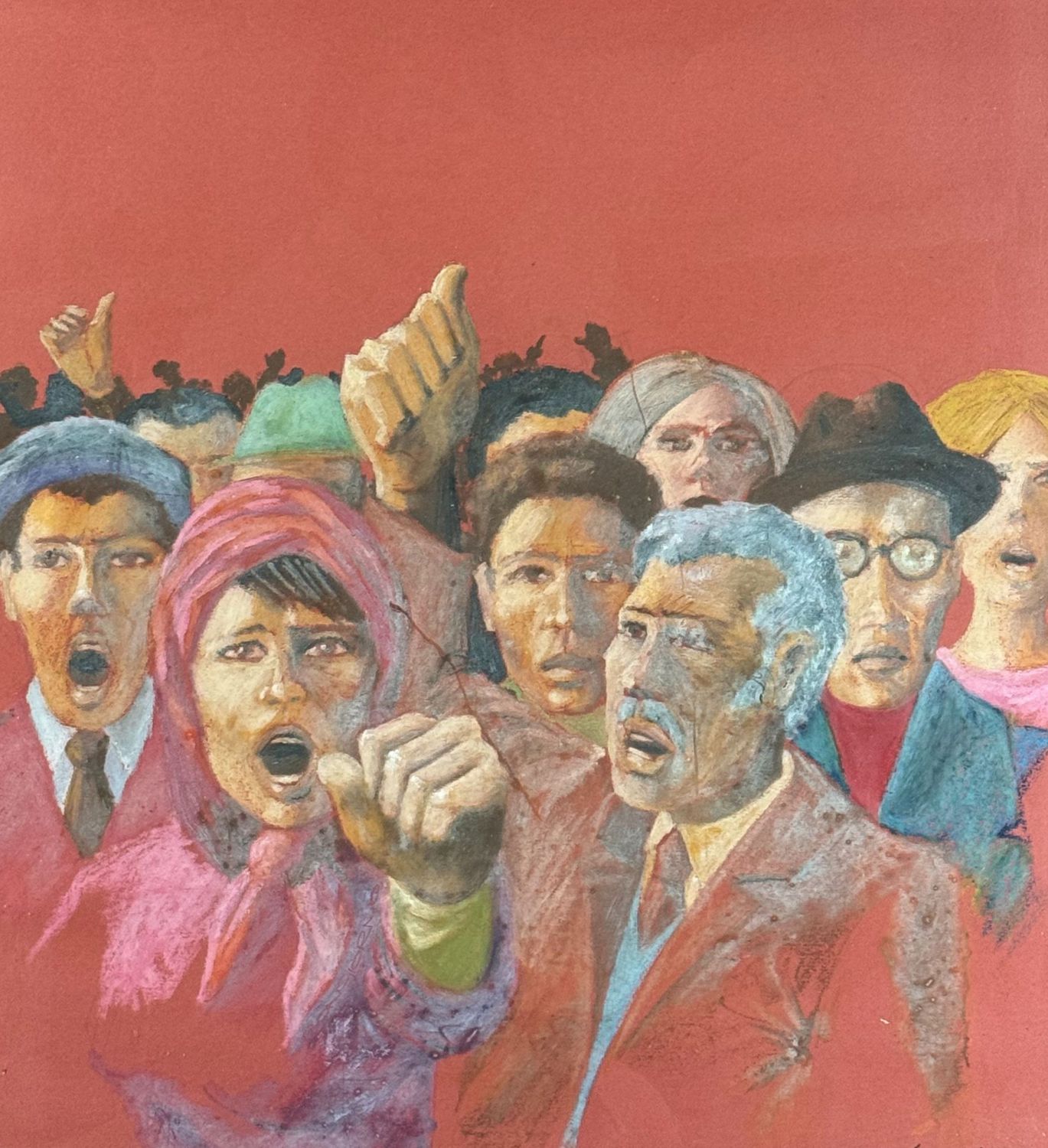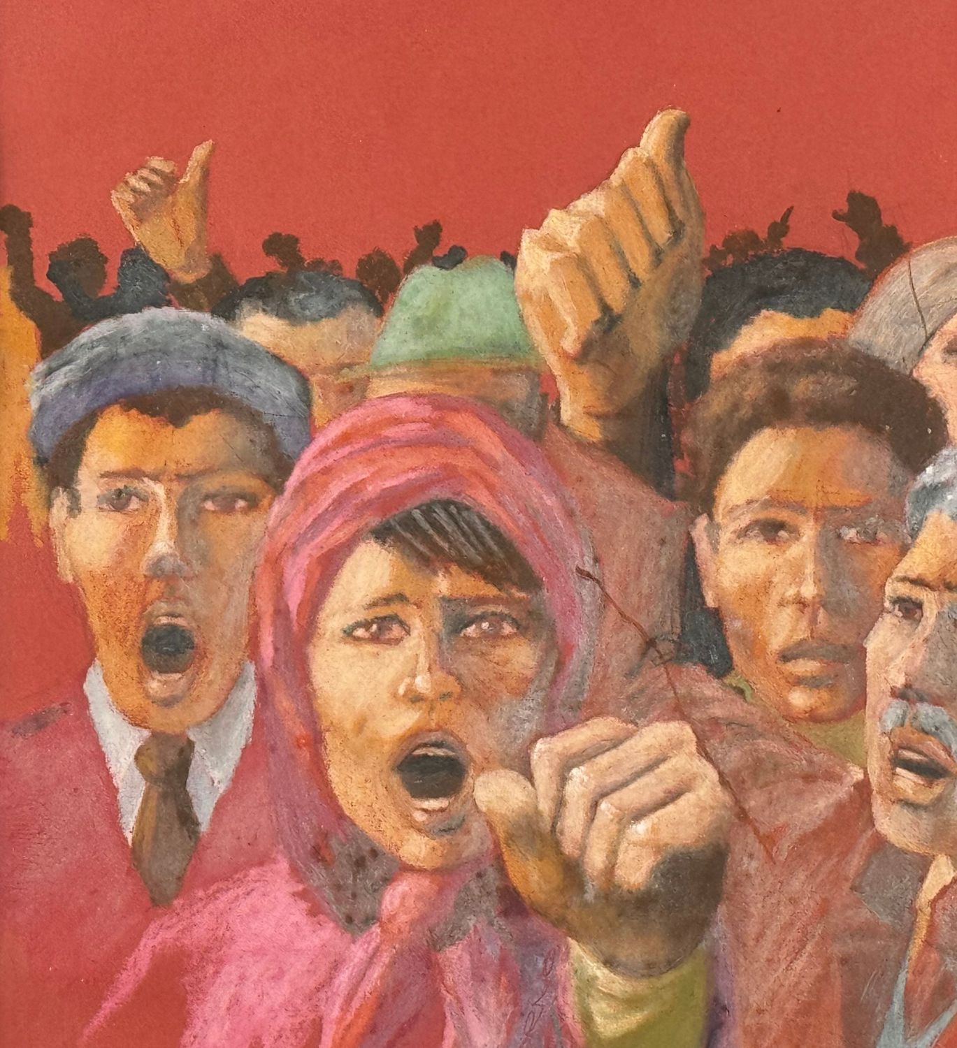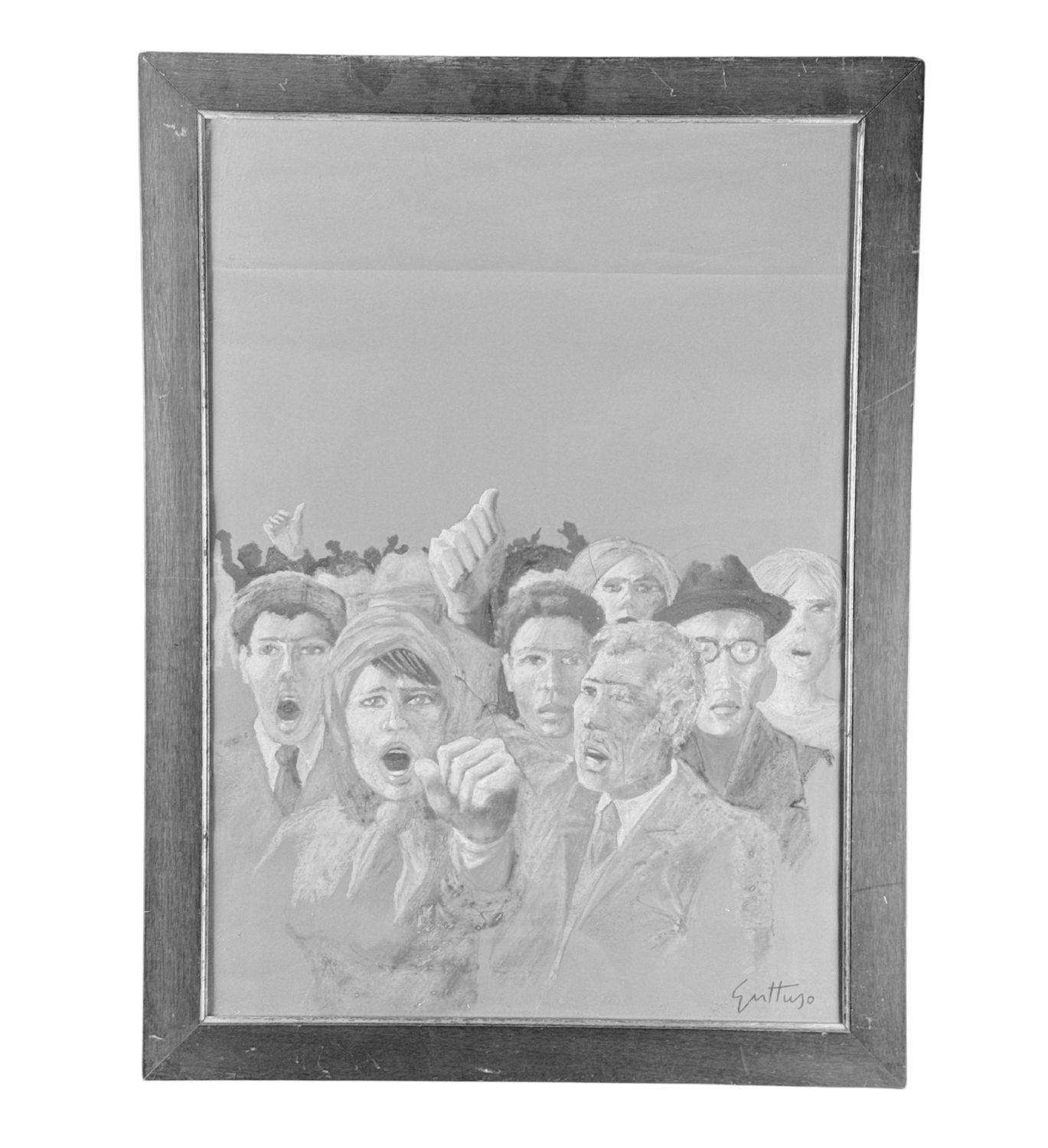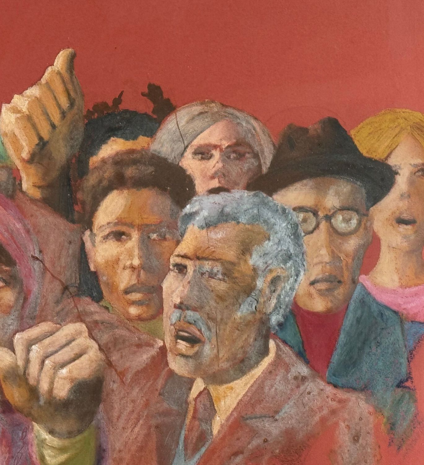 Dipinto tempera su carta, periodo XX secolo, scuola italiana raffigurante La forza del popolo: Il dipinto mostra una moltitudine di ritratti ognuno diverso ma uniti nello scopo comune di denuncia sociale. Colpisce l'armonia dell' utilizzo bilanciato dei colori a contrasto con le ombreggiature molto evidenti. Dimensioni compreso cornice: 78x58 cm. Dimensioni interno cornice: 70x50 cm. Reca firma Guttuso in basso a destra. Opera in buone condizioni.