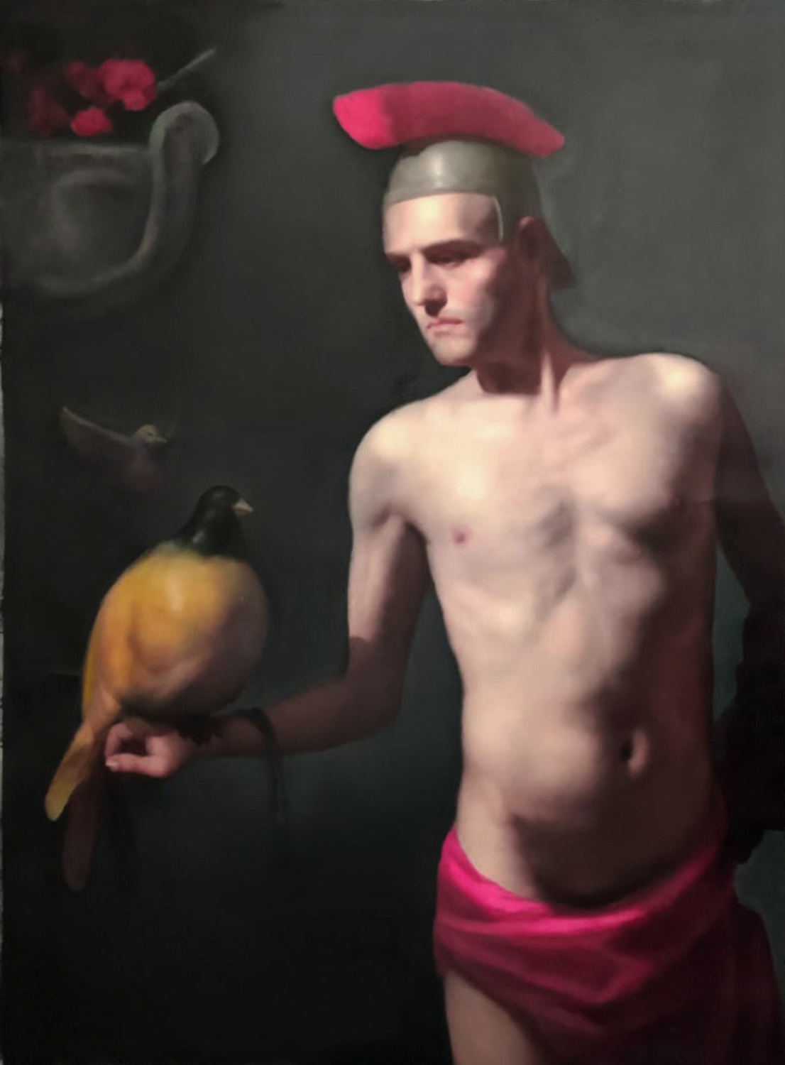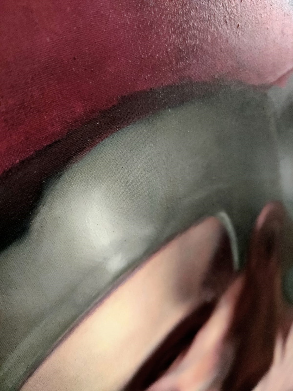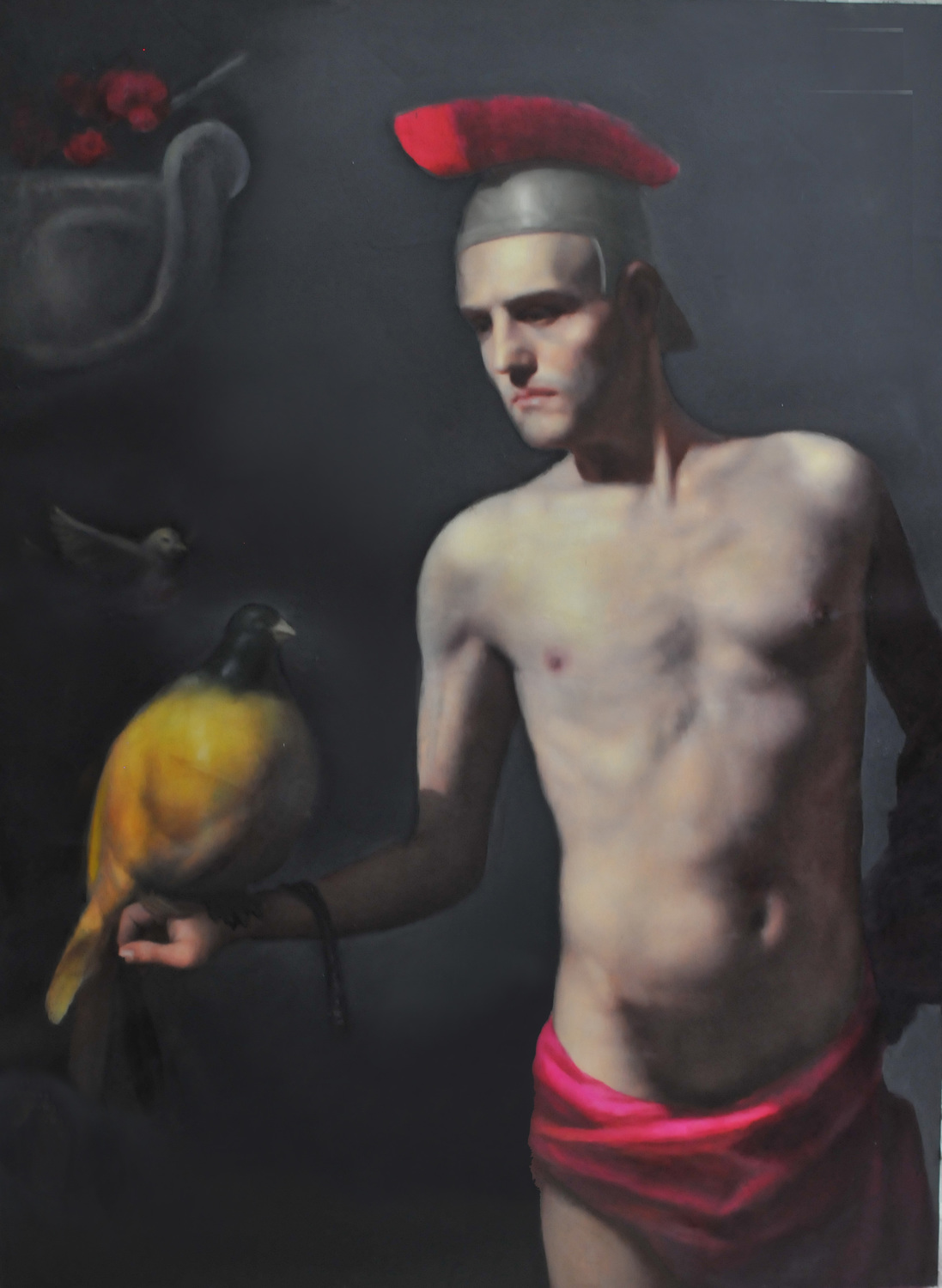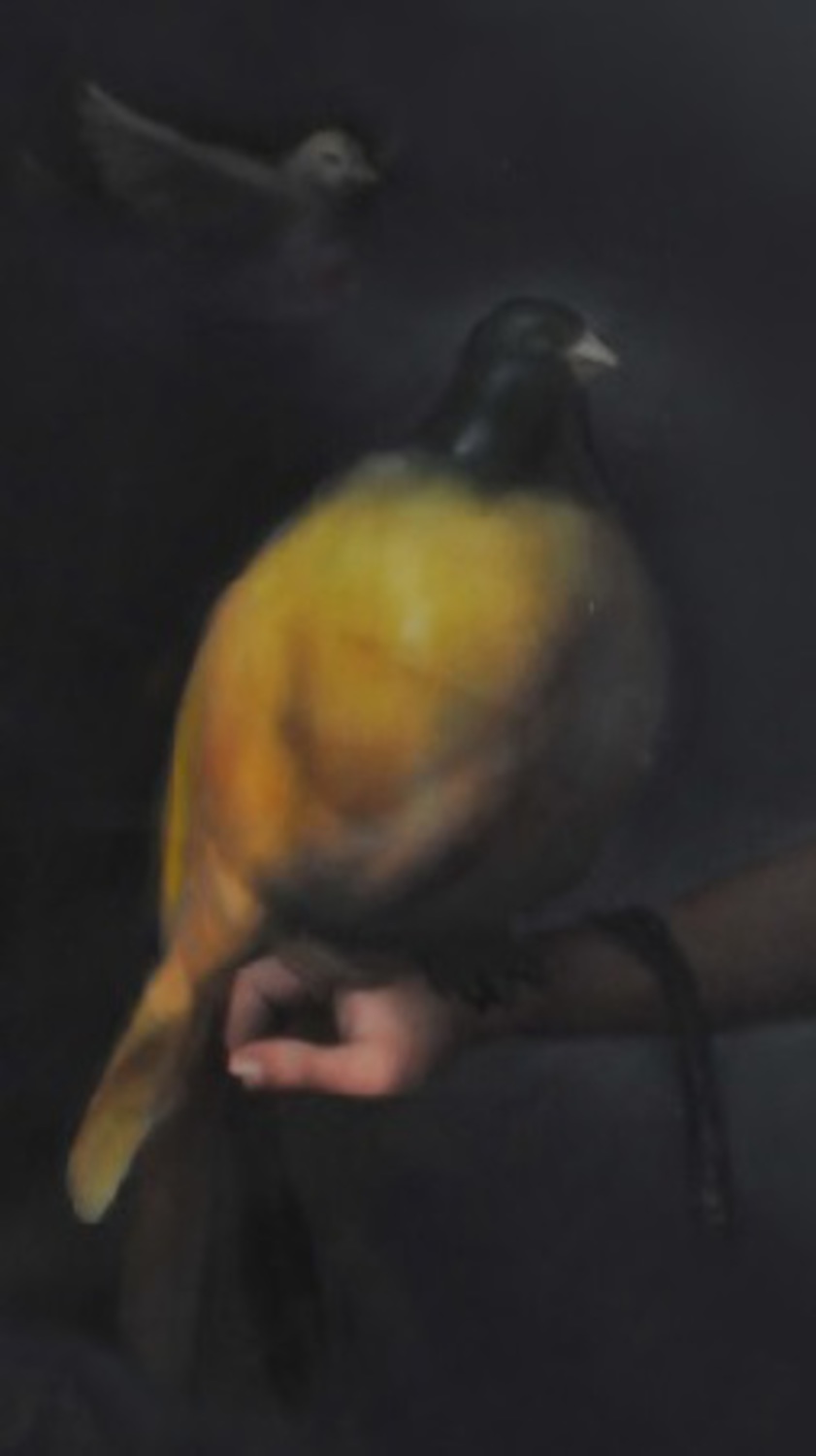 tela di cotone. Lo sfondo è buio, ma un buio vitalizzato da un bagliore lunare. Una luce che assiste e rassicura il viandante, in senso metafisico. L'uccello piu grande appartiene al mondo convenzionale, mentre il piccolo padroneggia il buio del mistero e si affaccia ne mondo convenzionale, invitando l'esploratore a seguirlo.