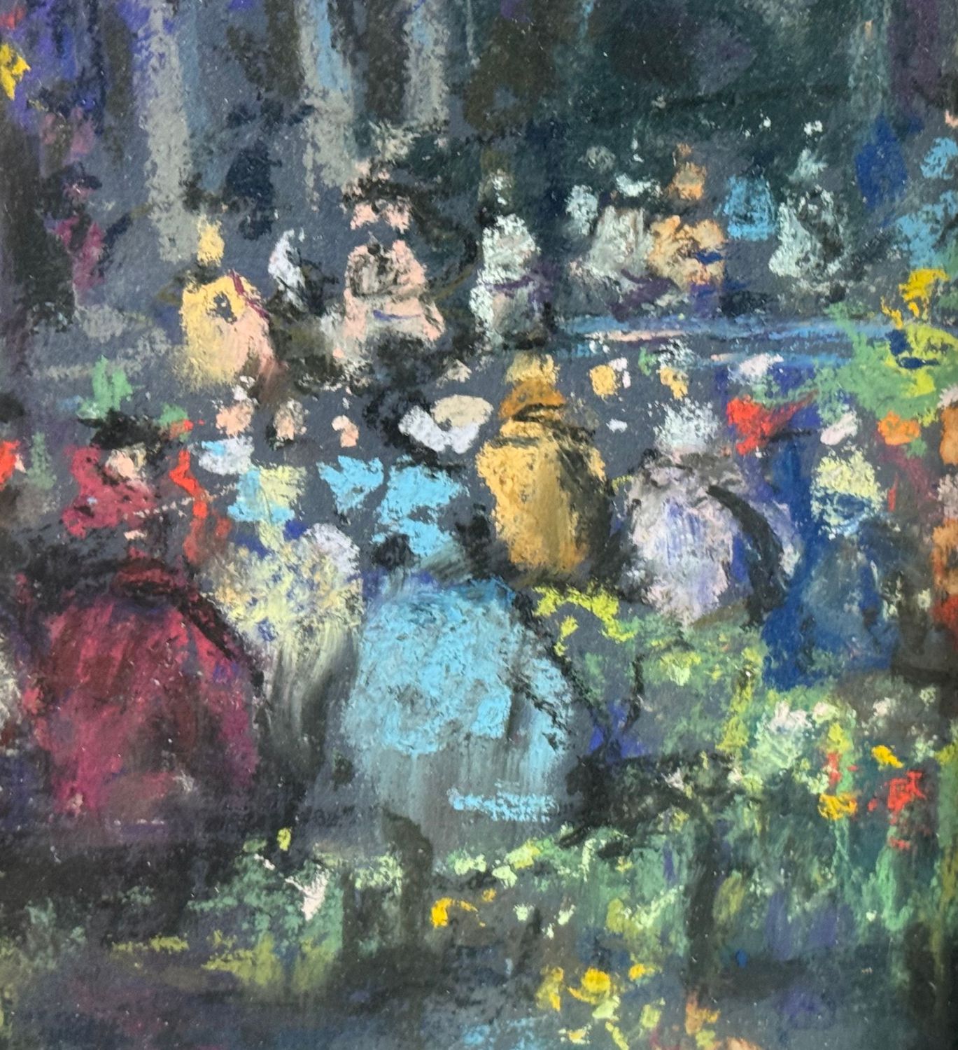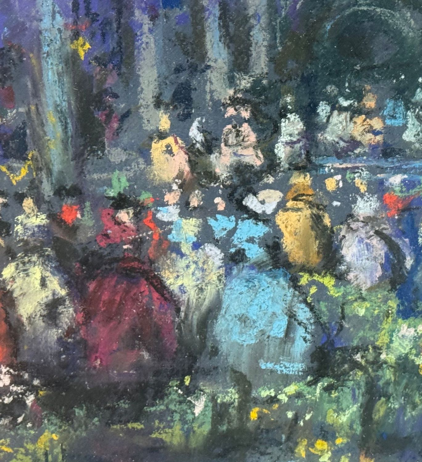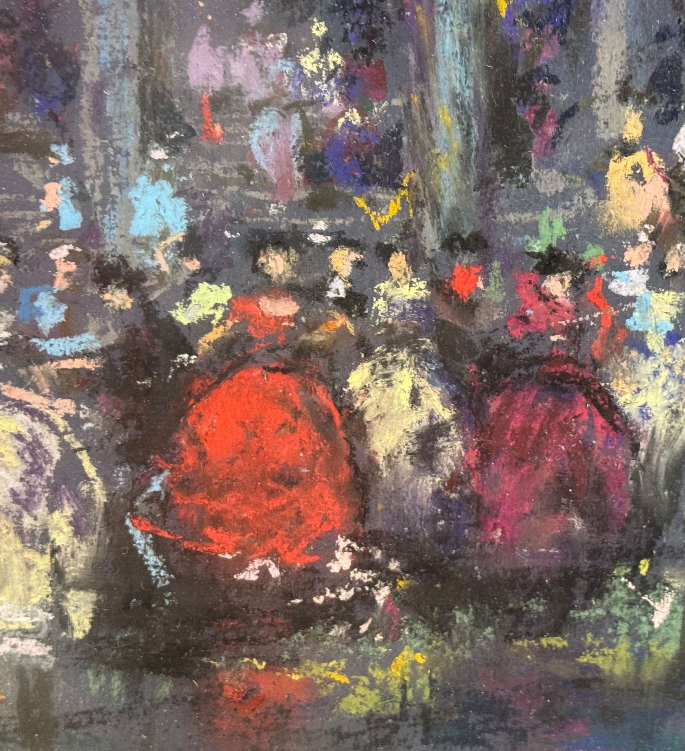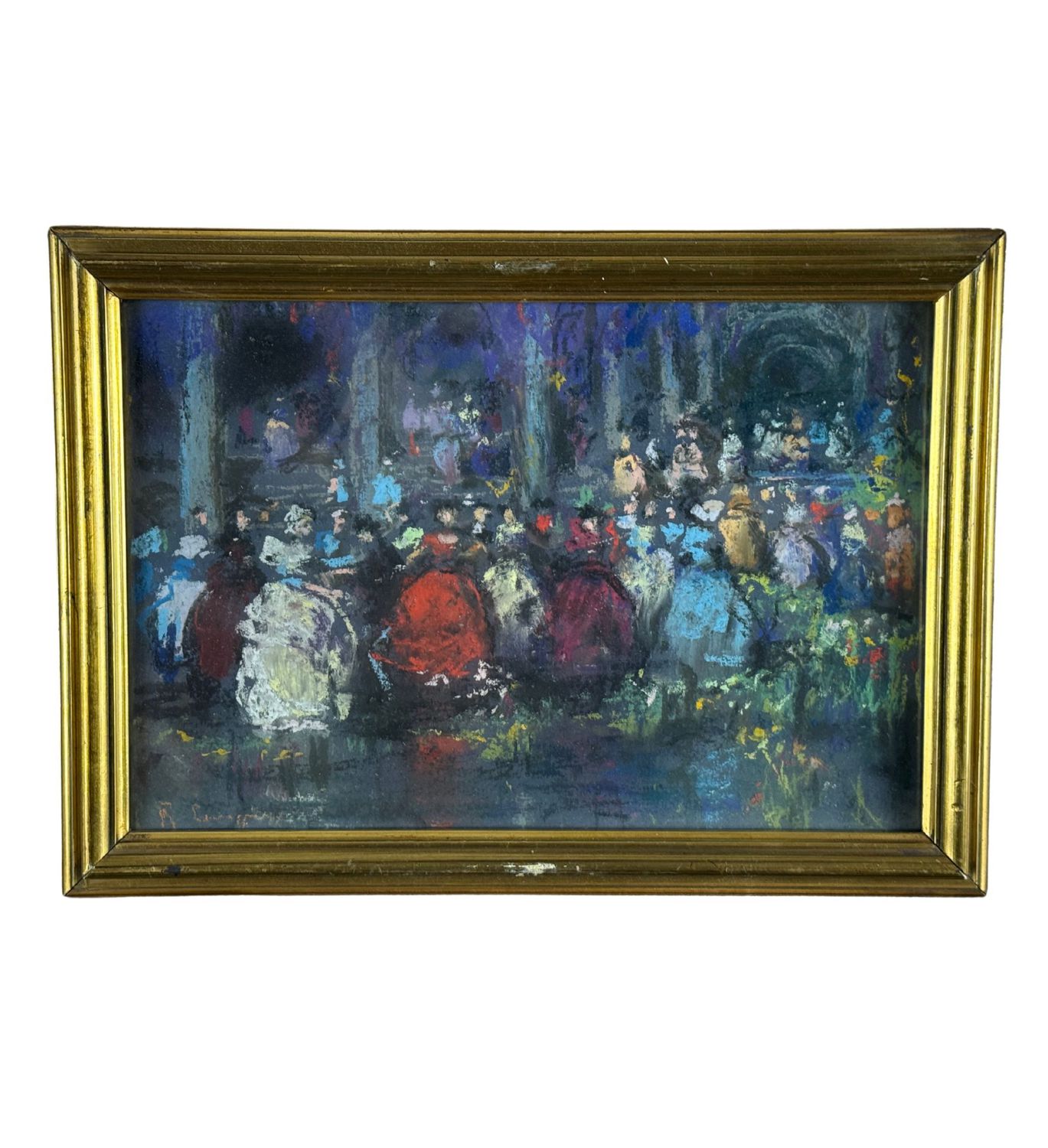 Dipinto olio e gessetto su cartoncino, periodo XX secolo scuola Italiana, raffigurante Festa di ballo. Dimensioni compreso cornice: 35x25 cm. Dimensioni interno cornice: 30x20 cm. Reca firma in basso a sinistra R. Carignani. Opera in buone condizioni.