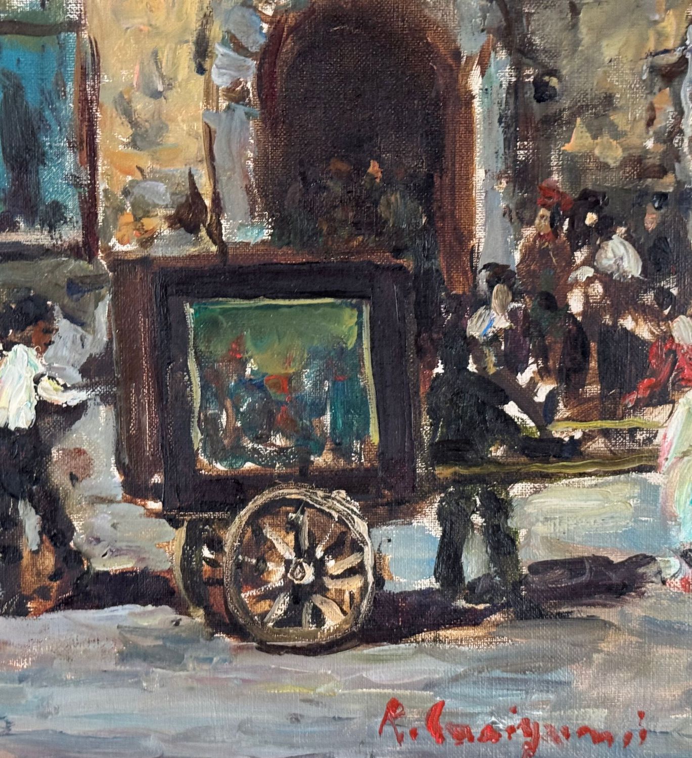 Dipinto olio su tela, periodo XX secolo scuola Italiana, raffigurante Scena popolare napoletana. Dimensioni compreso cornice: 66x57 cm. Dimensioni interno cornice: 51x40,5 cm. Reca firma in basso a destra R. Carignani. Opera in buone condizioni.