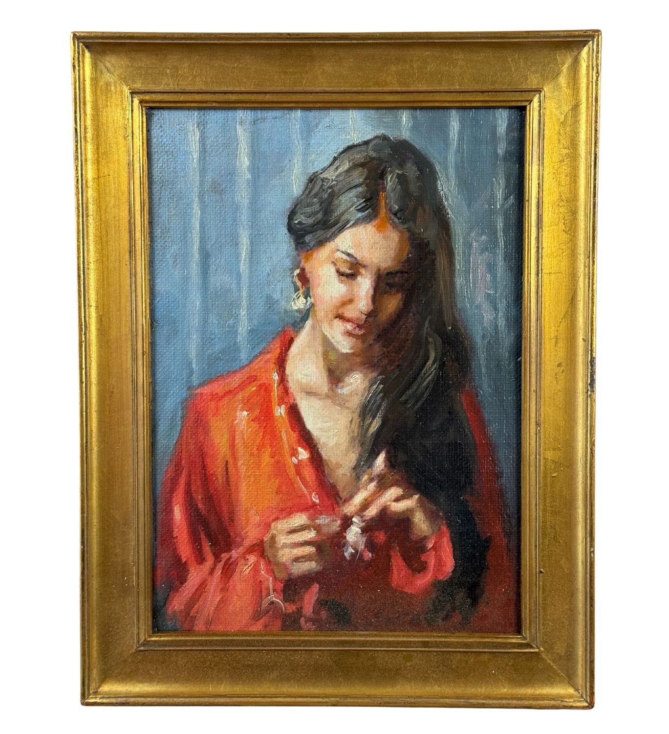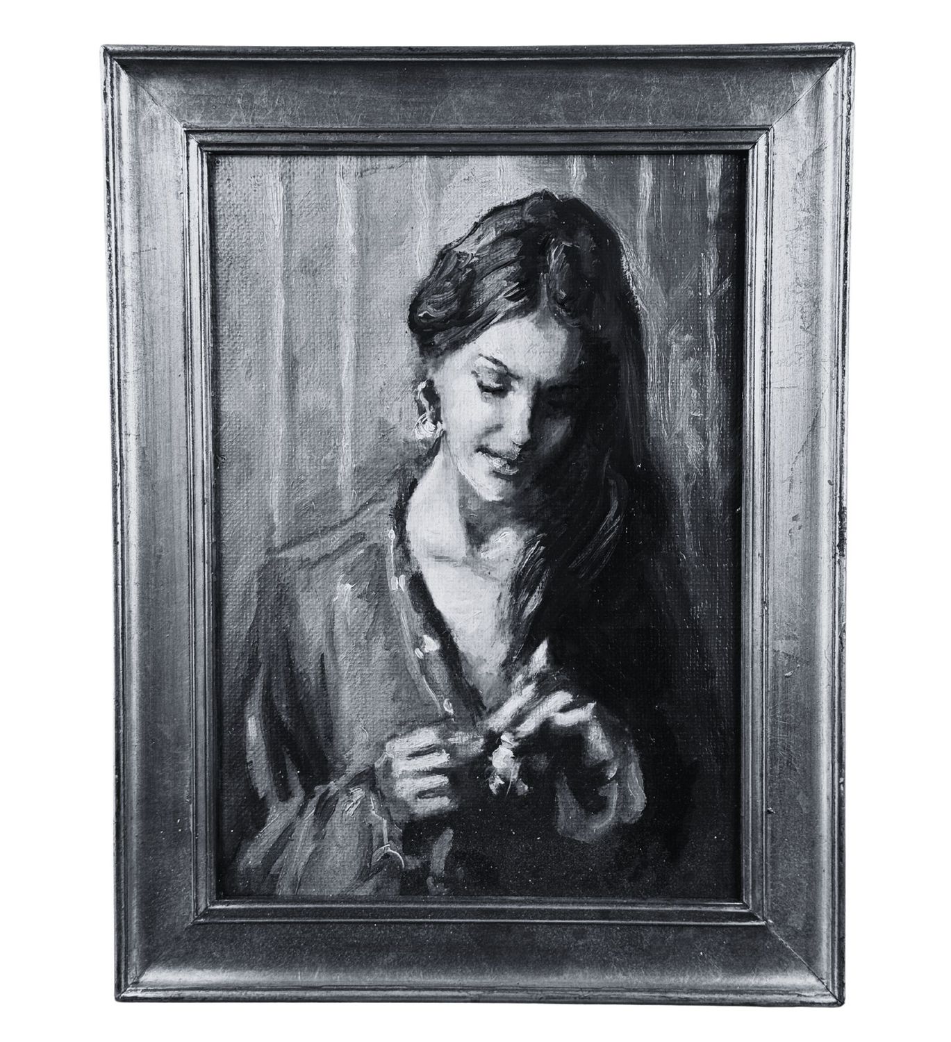 Dipinto olio su tela applicata su pannello, periodo XX secolo scuola italiana, raffigurante Ritratto di donna. Dimensioni compreso cornice: 36x46 cm. Dimensioni interno cornice: 26,5x37 cm. Da artista anonimo. Opera in buone condizioni.