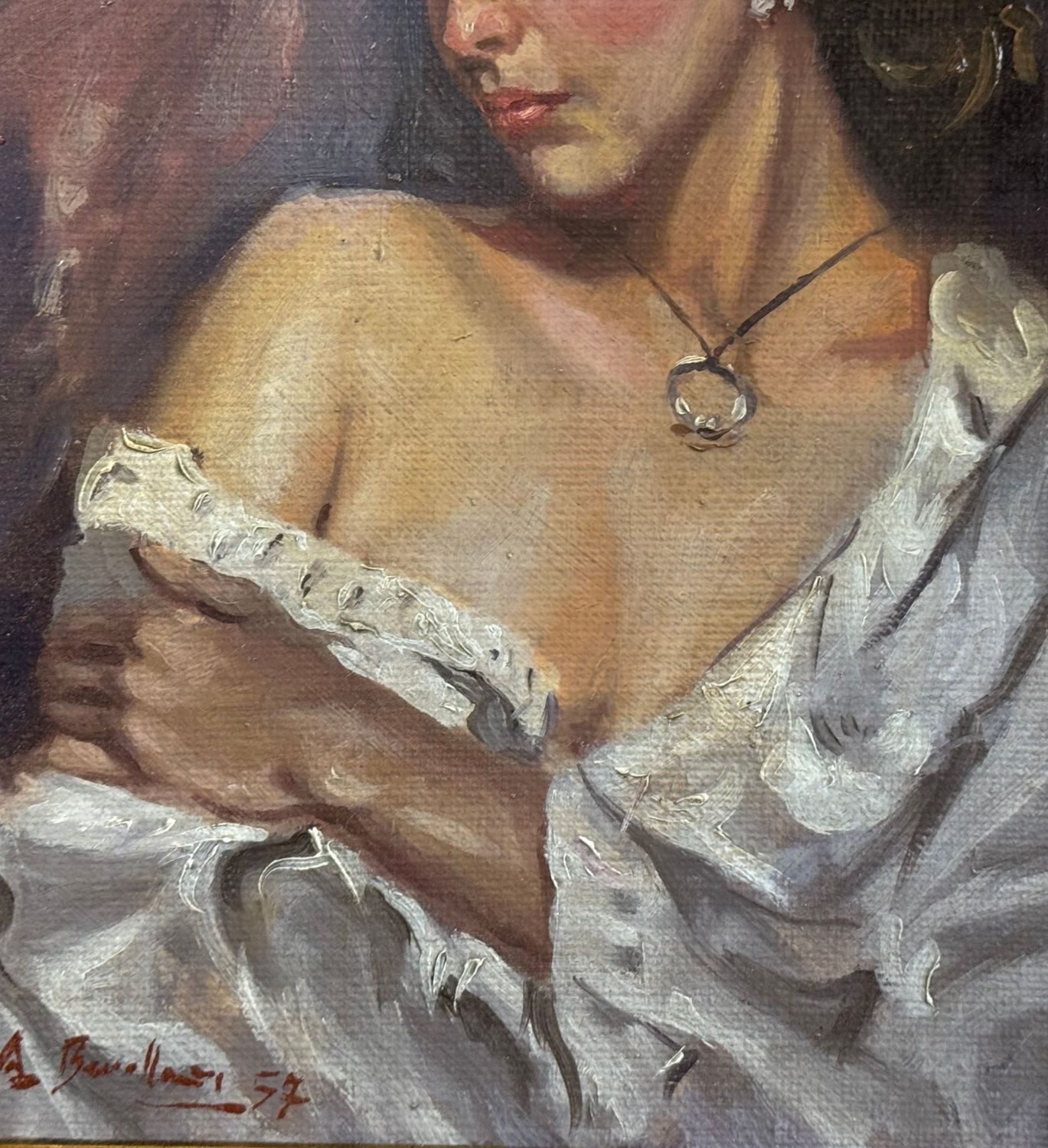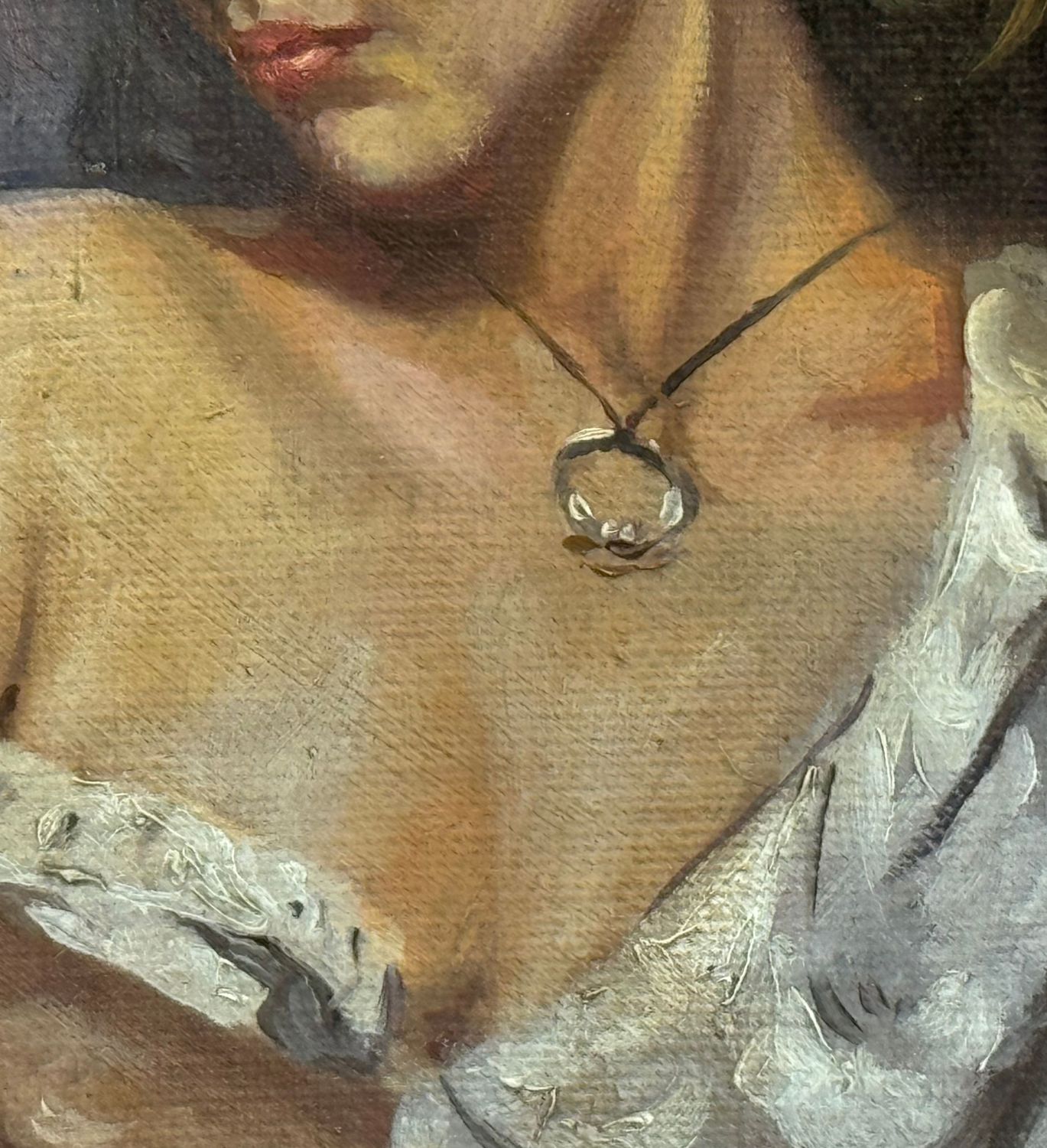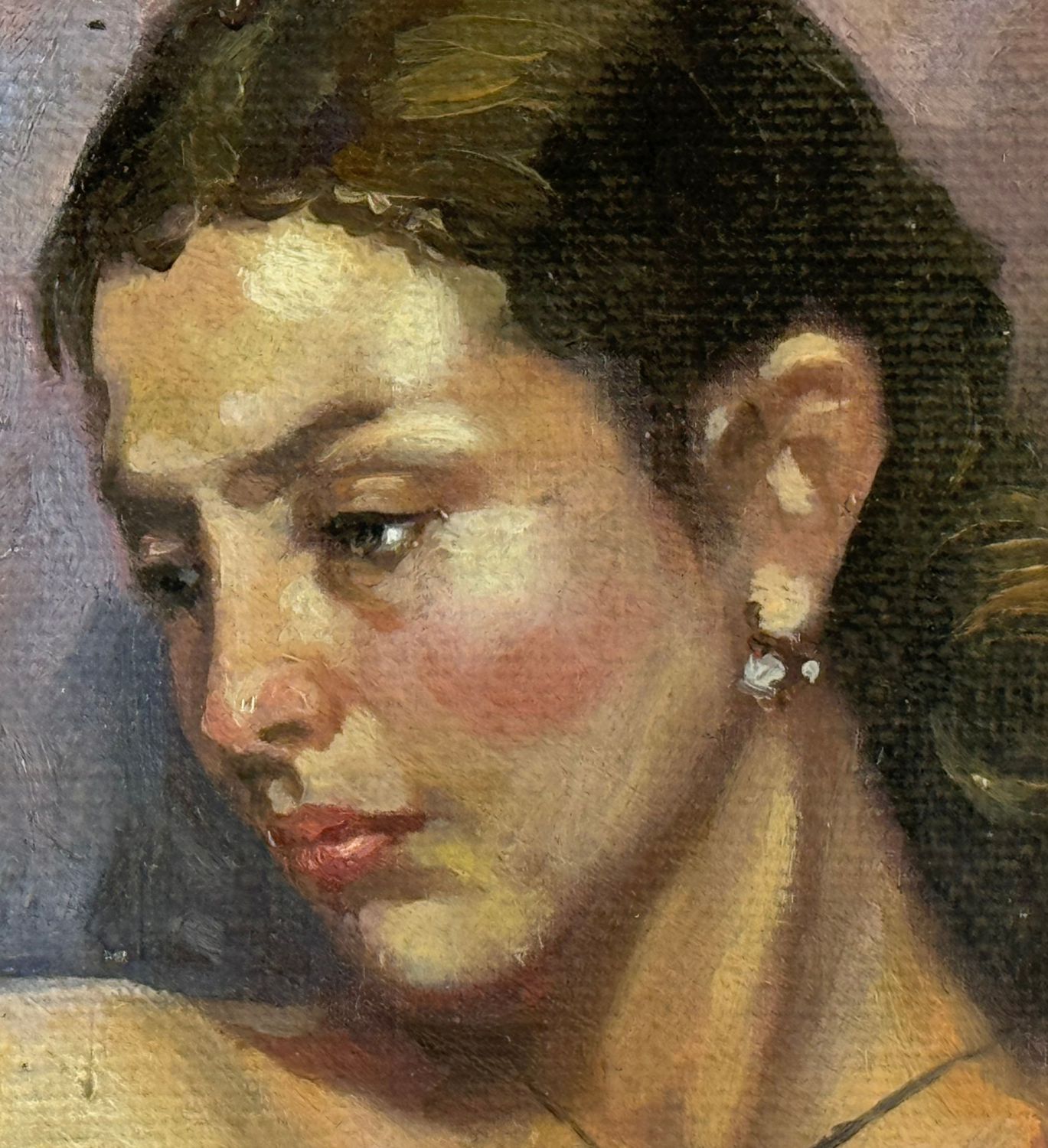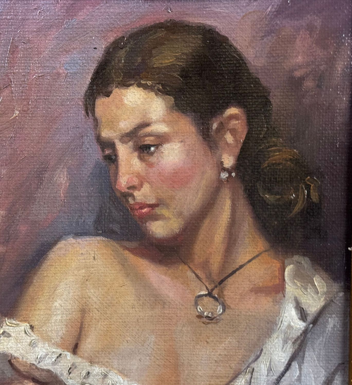 Dipinto olio su tela applicata su pannello, periodo XX secolo scuola italiana, raffigurante Ritratto di donna. Dimensioni compreso cornice: 36x46 cm. Dimensioni interno cornice: 26x37 cm. Reca firma in basso a sinistra da artista non identificato. Opera in buone condizioni.