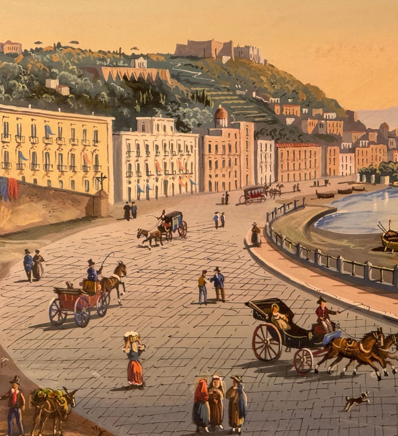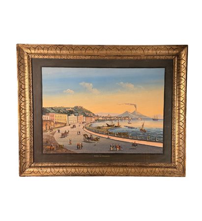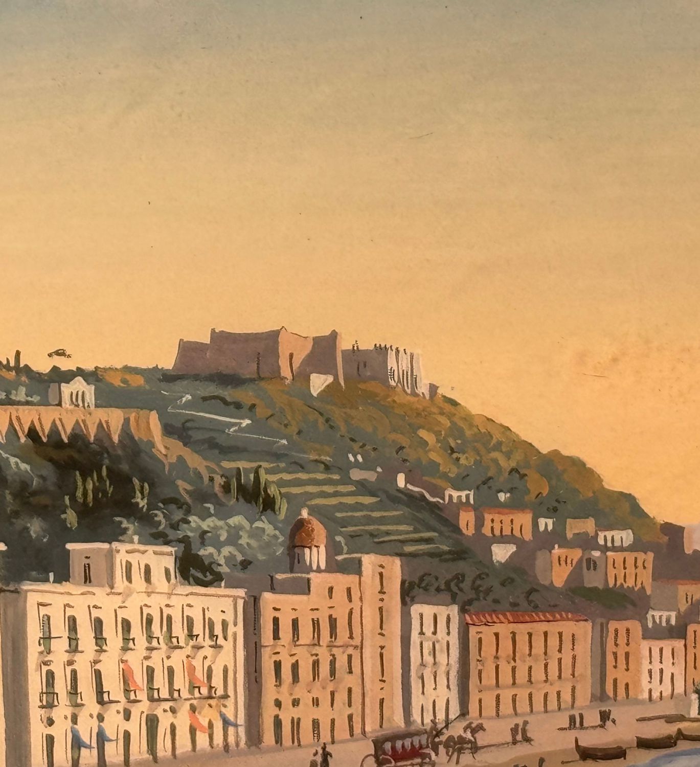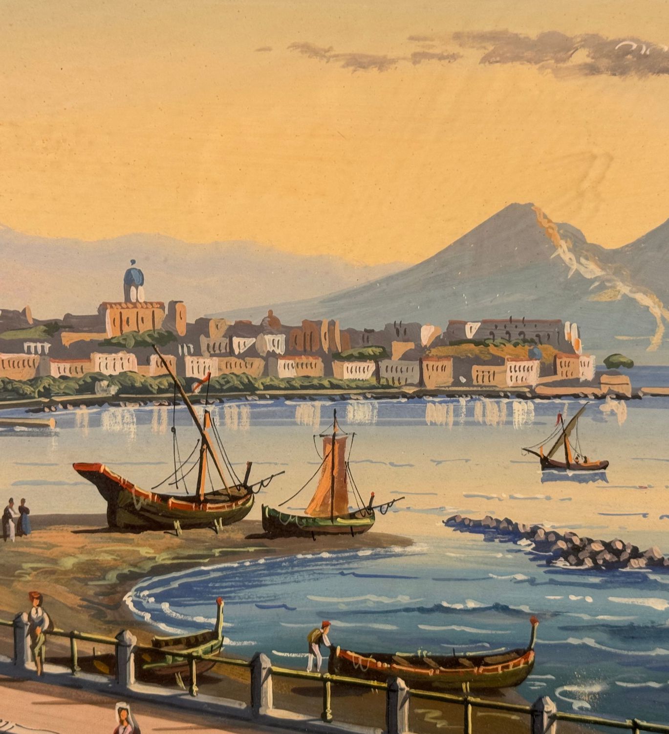 Dipinto guazzo (Acquerello su carta), periodo prima metà del XX secolo scuola Italiana, raffigurante Veduta di Napoli da Mergellina. Dimensioni compreso cornice: 74x94 cm. Dimensioni interno cornice: 60x80 cm. Da artista anonimo. Opera in buone condizioni.