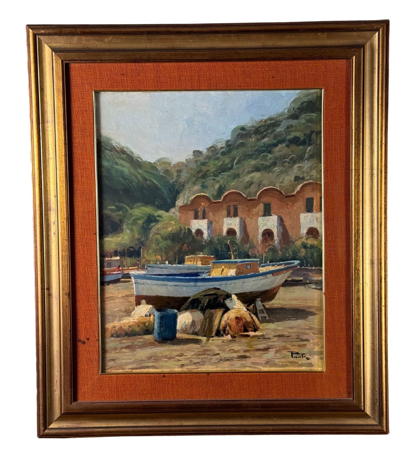 Dipinto olio su tela, periodo XX secolo scuola Italiana, raffigurante Scorcio di marina con barche a secco. Dimensioni compreso cornice: 61x71 cm. Dimensioni interno cornice: 40x50 cm. Reca firma in basso a destra Giovanni Parlato. Opera in buone condizioni.