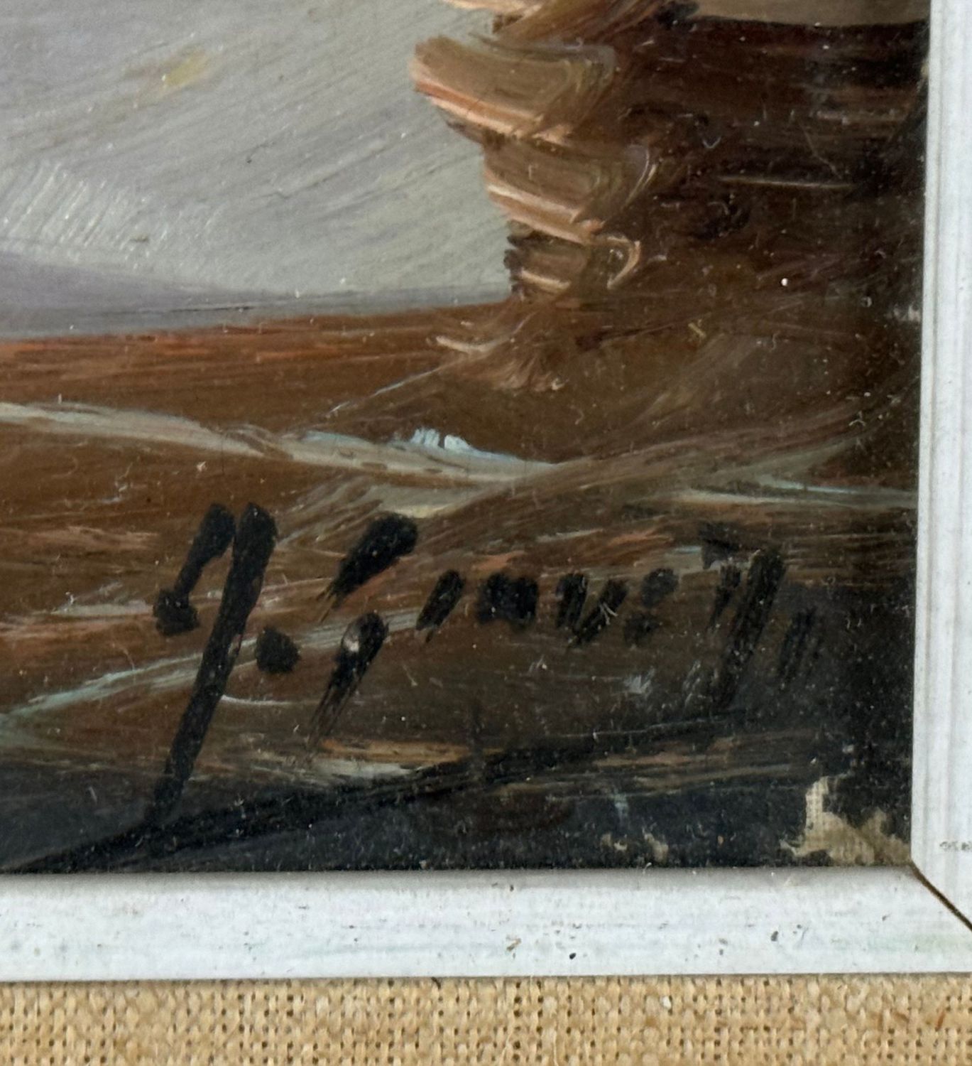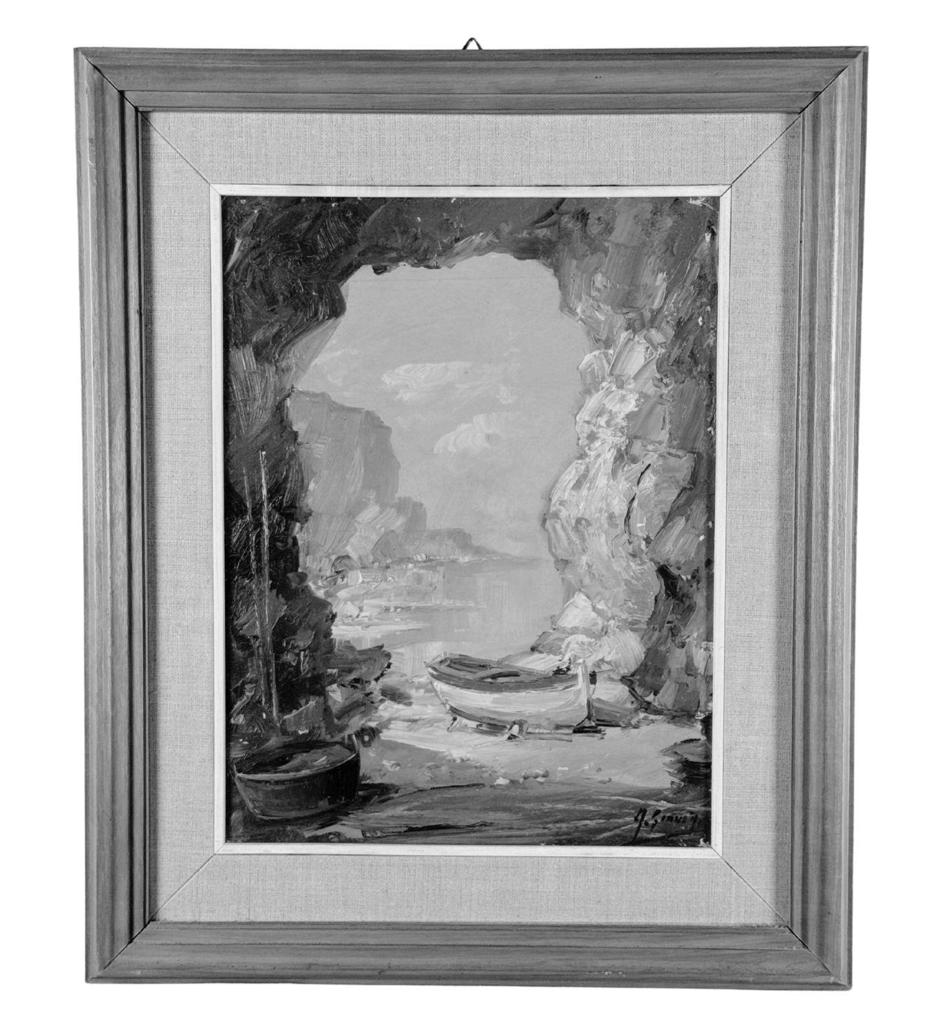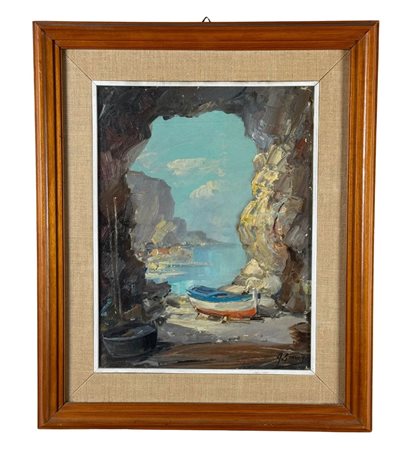 Dipinto olio su tela, periodo XX secolo scuola Napoletana, raffigurante Scorcio di marina con barca a secco. Dimensioni compreso cornice: 48x58 cm. Dimensioni interno cornice: 31x41 cm. Reca firma in basso a destra artista non identificato. Opera in buone condizioni.