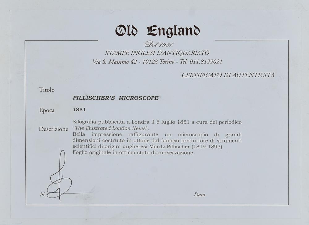 PILLISCER'S MICROSCOPE, Londra 1851 silografia, cm 27,2x22,4 (con cornice)...