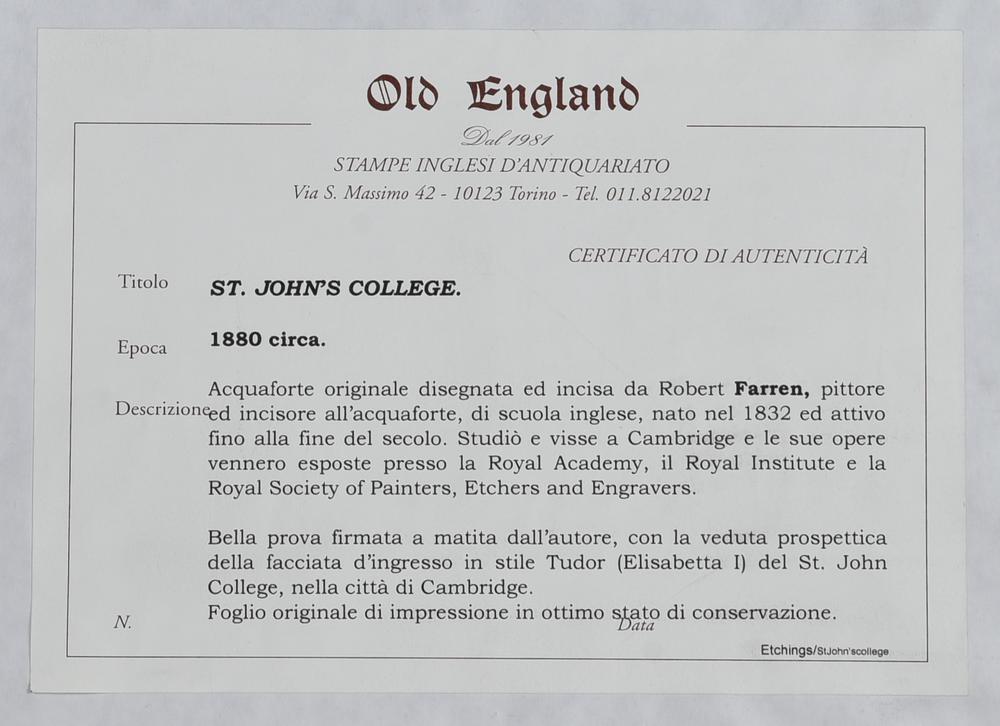 ST. JOHN'S COLLEGE, 1880 circa incisione all'acquaforte, cm 39,6x32,7 (con...