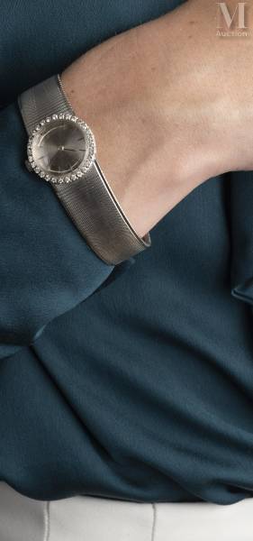 Montre de dame en or blanc 18k (750 millièmes), cadran miroir, index bâtons appliqué, couronne de remontoir signée. Lunette sertie de diamants ronds taille brillant.