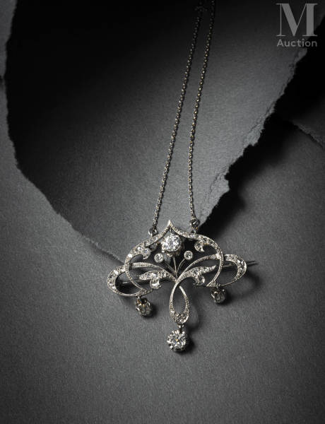 Ensemble en or blanc 18k (750 millièmes) comprenant une chaîne de cou formée d'une maille forçat et un pendentif Belle Epoque transformable en broche figurant un motif végétal mouvementé serti de diamants ronds tailles ancienne, rose et 8x8 et retenant trois diamants ronds en pampille.