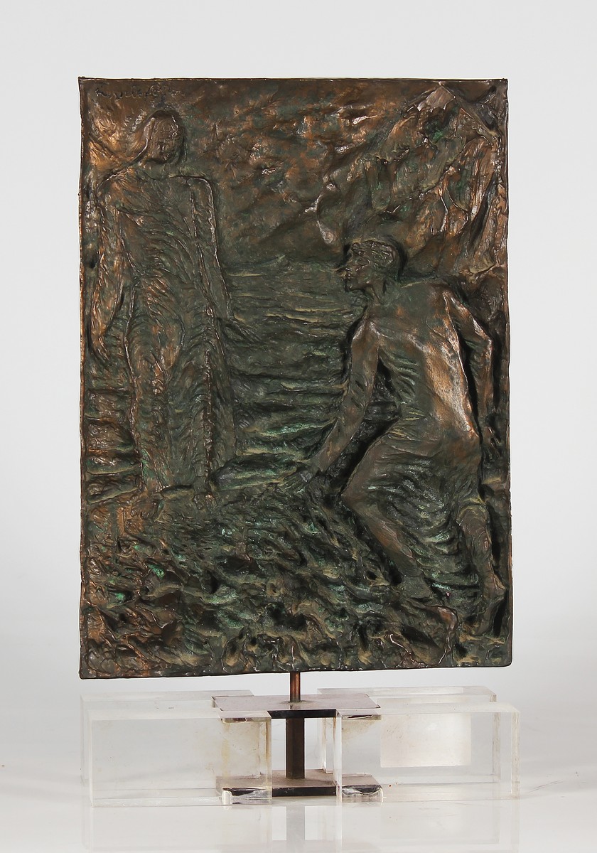 FAZZINI PERICLE (1913 - 1987) Dante incontra Virgilio. Bronzo. Cm 24,50 x 33,50 x 2,00. Base in plexiglass. Firma in alto a sinistra, titolo a lato.