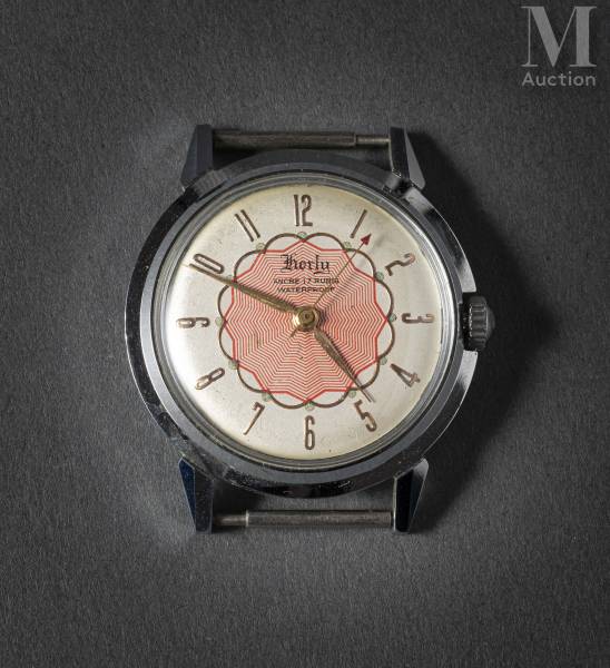 Montre ronde pour homme en acier. Cadran deux tons crème et rose guilloché, index bâtons alternés chiffres arabes. Mouvement mécanique à remontage manuel. Boîtier acier avec fond vissé (tropical protect) bagobloc. Diam.: 35mm. Sans bracelet.