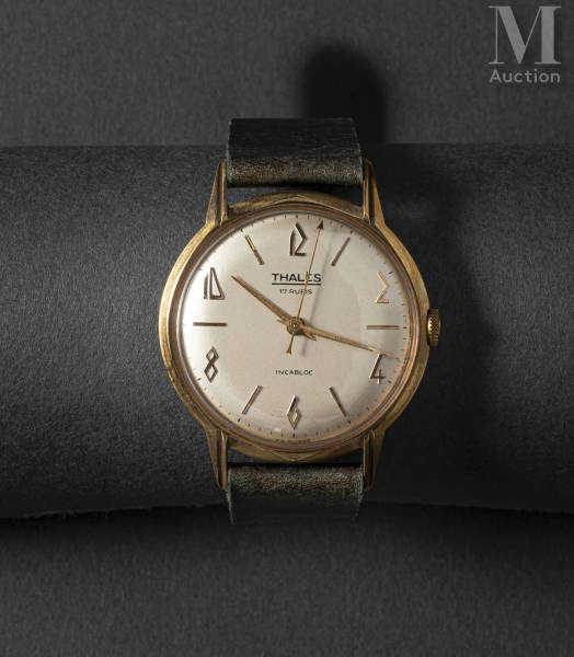 Montre ronde pour homme en plaqué or. Cadran crème avec index bâtons alternés chiffres arabes, trotteuse centrale, verre plexi. Mouvement mécanique à remontage manuel. Boîtier en plaqué or avec fond vissé en acier numéroté 10652. Diam.: 34mm.