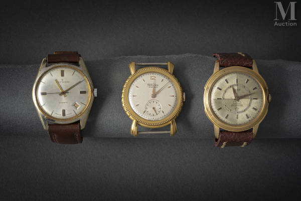 Lot de trois montres dont une Atlanta, une Herodia et Michel Herbelin. Cadrans fonds crème, sectoriel pour l'Atlanta, avec secondes à 6h et boîtier travaillé d'une frise de perles et de godrons pour l'Herodia.