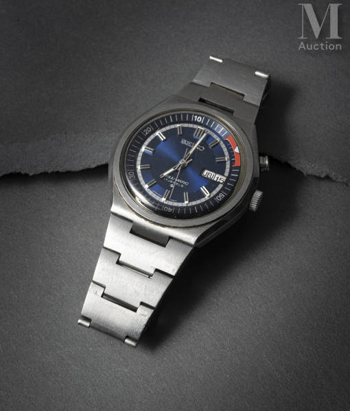 Montre en acier. Cadran nuancé bleu, index bâtons, aiguilles émaillées, seconde centrale, guichet jour et date à 3h, verre plexi. Mouvement mécanique à remontage automatique. Boîtier fond vissé numéroté. Diam.: 39.3mm. Bracelet acier, boucle déployante signée.