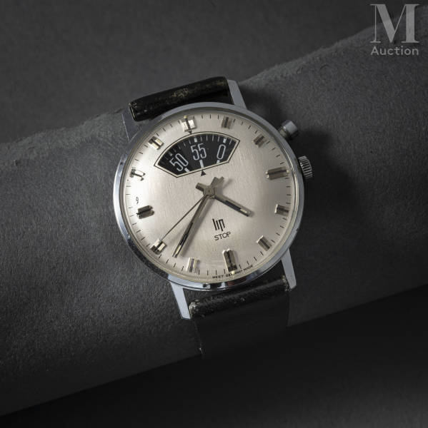 Montre ronde pour homme en acier, cadran crème avec index bâtons, seconde centrale, guichet à midi pour voir le temps écoulé, poussoir à 2h pour la remise à zéro, verre plexi. Mouvement mécanique à remontage manuel Calibre Lip R 870. Boîtier en acier avec fond vissé numéroté 348861. Diam.: 34mm. Bracelet noir avec boucle ardillon.
