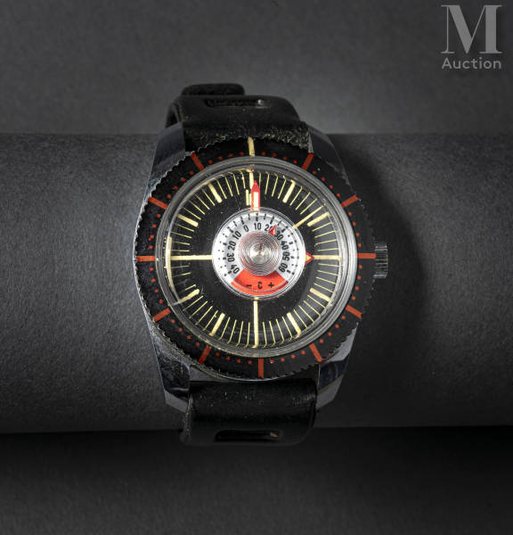 Montre de plongée pour homme, boîtier chromé avec fonction thermomètre. Cadran noir sectoriel avec index bâtons, indication de la température au centre. Lunette tournante bidirectionelle. Mouvement mécanique à remontage manuel. Boîtier chromé avec fond vissé. Diam.: 36mm. Bracelet cuir perforé avec boucle ardillon.
