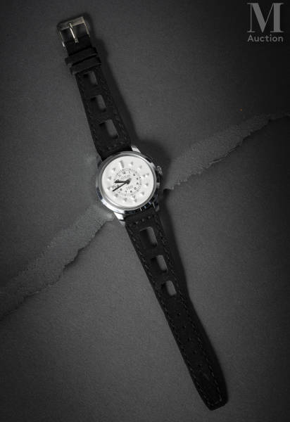 Montre Action en chrome. Cadran fond blanc, index chiffres arabes et chemin de fer accompagné d'index en relief pour malvoyants, protégé par un verre plexi, ouvrable par poussoir rectangulaire latéral. Mouvement mécanique à remontage manuel. Bracelet cuir, boucle ardillon métal.